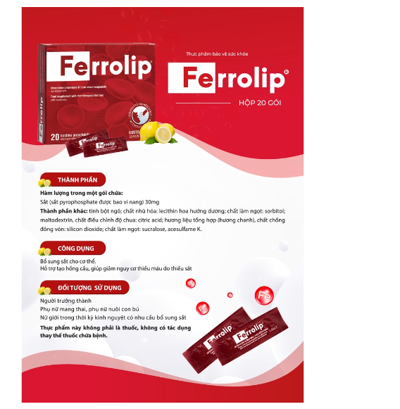 - Nữ giới trong thời kỳ kinh nguyệt có nhu cầu bổ sung sắt Lưu ý: Đối với trẻ dưới 6 tuổi cần tham khảo ý kiến của bác sĩ trước khi sử dụng sản phẩm Ferrolip Thành phần sắt Ferrolip 1 gói bột sắt Ferrolip có chứa: Sắt iii pyrophosphate được bao vi nang (bao màng liposome). Hàm lượng sắt nguyên tốt mỗi gói tương ứng 30mg. Phụ liệu: tinh bột ngô, chất nhũ hóa: lecithin, chất điều chỉnh độ chua: axit citric; chất điều hương; chất ổn định: silicon dioxide; chất tạo ngọt: sorbitol, maltodextrin, sucralose, acesulfame K. Tham khảo: Công dụng sắt Ferrolip Bổ sung sắt cho cơ thể. Hỗ trợ tạo hồng cầu, giúp giảm nguy cơ thiếu máu do thiếu sắt. Ferrolip có tốt không? Thực phẩm bổ sung sắt Ferrolip được các bác sĩ của nhiều bệnh viện lớn tại Hà Nội tin tưởng sử dụng để bổ sung sắt cho các đối tượng. Liều dùng, hướng dẫn sử dụng và cách bảo quản Ferrolip Liều dùng Ferrolip Khuyến nghị sử dụng: 1 gói Ferrolip/ngày. Sản phẩm có thể sử dụng trực tiếp à không cần hòa tan với nước. Ferrolip có dạng bột có vị chanh dễ chịu, không tanh, không dư vị kim loại. Hướng dẫn sử dụng Sử dụng trực tiếp: Đổ từ từ gói Ferrolip vào miệng. Sắt Ferrolip với dạng buccal sẽ tan ngay trong miệng mà không để lại dư vị kim loại như các sản phẩm bổ sung sắt khác trên thị trường. Cách bảo quản Bảo quản nhiệt độ phòng, nơi khô thoáng, tránh ánh nắng mặt trời. Để xa tầm tay trẻ em. Sản phẩm có hạn dùng 36 tháng kể từ ngày sản xuất. Ngày hết hạn xem tại “Best before end” trên vỏ hộp sản phẩm.