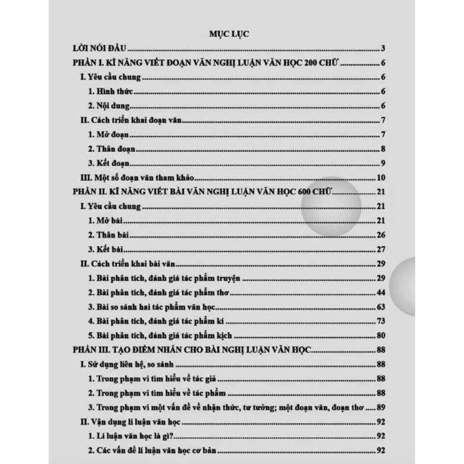 - Một số nhân vật, sự việc, câu chuyện truyền cảm hứng II . Kỹ Năng Viết Bài Nghị Luận Văn Học : Làm văn là một phần quan trọng trong môn học Ngữ Văn , làm văn có tính chất quyết định đánh giá kết quả học tập môn Ngữ Văn . Cuốn sách được biên soạn theo chương trình mới của Bộ Giáo Dục với các mục đích chính : giúp giáo viên có thêm tài liệu tham khảo cho quá trình luyện thi , giúp phụ huynh có thêm tài liệu để kiểm tra kết quả học tập của con em , giúp các em học sinh có thêm tài liệu , bài tập để học tập và nâng cao kiến thức và làm tốt hơn các bài kiểm tra tại lớp, các bài thi học kỳ , thi học sinh giỏi, ôn thi THPT Quốc Gia. Những đoạn văn, bài văn trong sách này không phải là khuôn mẩu để các em sao chép mà chỉ là những gợi ý , suy luận có tính chất tham khảo . Trong quá trình làm văn các em cần phải có những ý tưởng mới lạ, đặc sắc và của riêng bản thân mình .