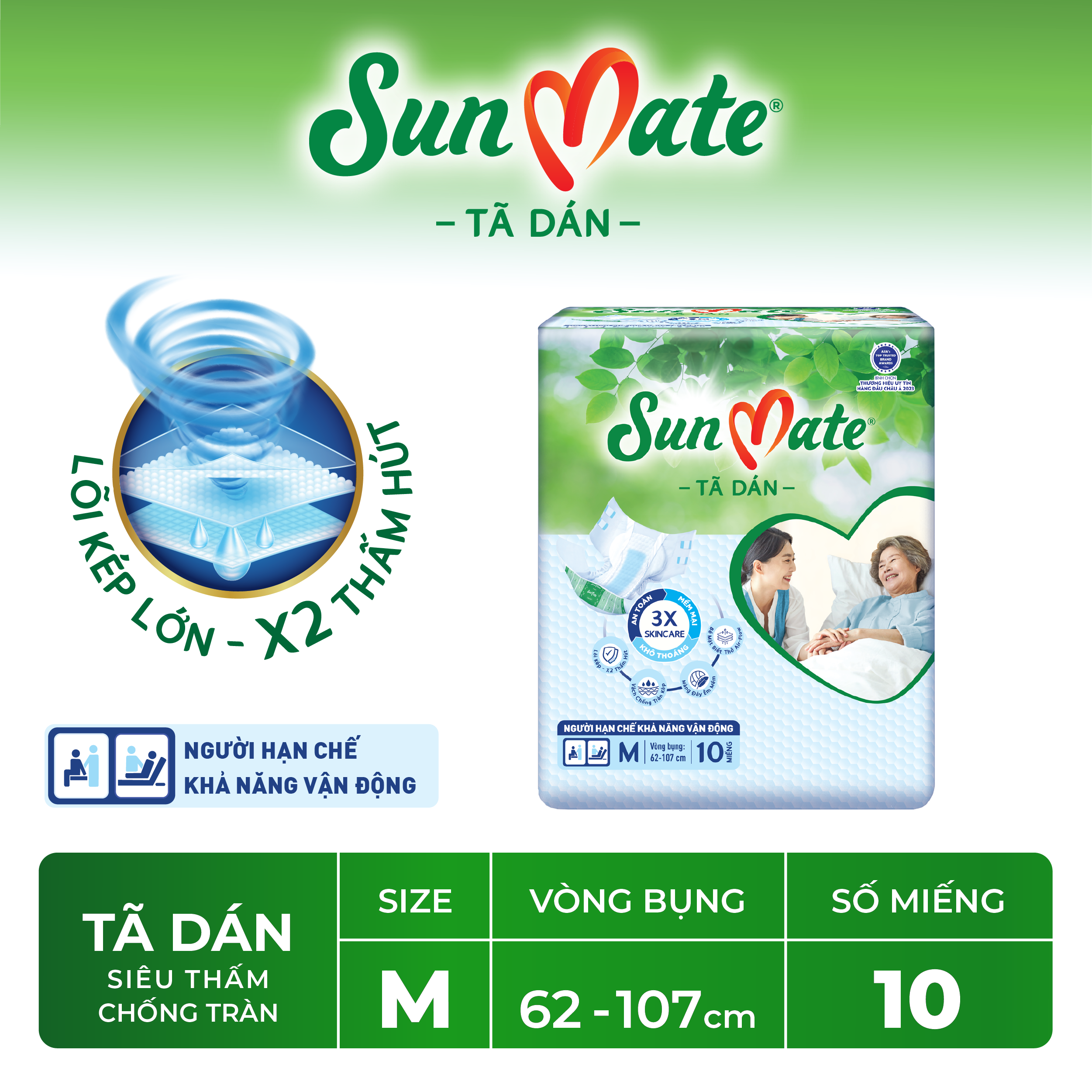 - Tã Dán Người Lớn SunMate Size M10 (10 Miếng) là sản phẩm đột phá sử dụng chất liệu vải không dệt kết hợp với vách chống tràn giúp ngăn chất lỏng rò rỉ ra hai bên. Bề mặt tã mềm mại có hiển thị ẩm ướt giúp cho việc chăm sóc người cao tuổi được dễ dàng thuận lợi hơn. Giúp người già thoải mái, tự tin vui sống. Đặc điểm nổi bật Mặt đáy dạng vải thoáng khí
