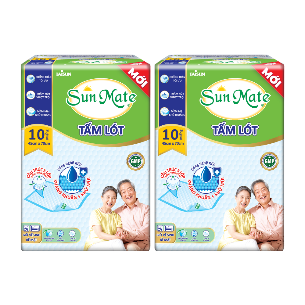 Combo 2 Tấm lót SunMate cải tiến mới (45 x 70cm) Giới thiệu Sản phẩm tấm lót SunMate dành cho cả nam và nữ, phù hợp với người hạn chế khả năng đi lại. Hạt gel tác động kép siêu thấm hút và kháng khuẩn hiệu quả cùng lớp dẫn thấm thông minh thấm hút nhanh, ngăn thấm ngược hiệu quả, giúp luôn khô thoáng, thoải mái cho người sử dụng. Tấm lót SunMate cải tiến mới với hai kích thước: 45cmx70cm và 60cmx70cm, giúp người dùng có nhiều sự lựa phù hợp với nhu cầu sử dụng. Với thiết kế mới, cấu trúc 5 lớp chống tràn tối ưu và 4 góc keo dán cố định, giúp người dùng thoải mái và an tâm hơn khi sử dụng. Sản phẩm an toàn, chất lượng cao, được sản xuất đạt tiêu chuẩn GMP và chứng nhận quản lý chất lượng quốc tế ISO 9001 Hạn sử dụng: 3 năm kể từ ngày sản xuất Chất liệu PP, PE, Hạt siêu thấm, polyme kết dính, bông cellulose, BOPP, vải không dệt trắng Đặc điểm nổi bật Lõi siêu thấm tác động kép với hạt siêu thấm – kháng khuẩn – khử mùi: Tăng khả năng thấm hút vượt trội, hạn chế sự phát triển của vi khuẩn và giảm thiểu mùi khó chịu. Rãnh thoáng khí: Rãnh tổ ong đa diện (kích thước 45cmx70cm) và rãnh kim cương (kích thước 60cmx70cm) Thiết kế trải rộng: Tối đa diện tích bề mặt, giúp người dùng thoải mái trong mọi cử động. Chống tràn tối ưu: Cấu trúc 5 lớp cùng màng đáy PE, chống tràn, ngăn ngừa tuyệt đối chất lỏng rò rỉ ra ngoài, giữ bề mặt luôn sạch sẽ. 4 góc khóa dán cố định: giúp định vị tấm lót, chống xê dịch trong quá trình sử dụng. Công dụng Tấm lót SunMate được dùng chăm sóc vệ sinh cho bệnh nhân sau mổ, bệnh nhân nằm lâu trên giường bệnh, phụ nữ sau sinh, người sử dụng tã cần hỗ trợ thêm, bảo vệ chống tràn và giữ vệ sinh giường, ghế, xe lăn…. Hướng dẫn sử dụng Trải phẳng tấm lót lên bề mặt giường, ghế… Giúp người sử dụng ngồi/nằm lên tấm lót, điều chỉnh tấm lót cho phù hợp Hướng dẫn bảo quản Bảo quản nơi khô ráo, thoáng mát: Tránh ánh nắng trực tiếp và nơi ẩm ướt. Để xa tầm tay trẻ em. Tiêu chuẩn an toàn Sản phẩm đã được kiểm nghiệm và cấp phép lưu hành, đảm bảo an toàn cho người sử dụng. Lưu ý sử dụng Thay tấm lót sau khoảng 3-4 tiếng sử dụng hoặc ngay sau khi tiêu bẩn để giữ cho người dùng luôn sạch sẽ Cuộn lại và bỏ vào thùng rác sau khi sử dụng, không tiêu hủy vào bồn cầu Khuyến cáo Tư vấn bác sĩ: Nếu bạn gặp phải bất kỳ vấn đề sức khỏe nào liên quan đến việc tiểu tiện, hãy tham khảo ý kiến bác sĩ. Không sử dụng lại miếng lót đã dùng. Bao bì Sản phẩm thay đổi tùy theo đợt hàng Thông tin thương hiệu: SunMate là một thương hiệu thuộc sở hữu của công ty Taisun Việt Nam là Công ty với hơn 20 năm chuyên sản xuất các sản phẩm chăm sóc người lớn tuổi, phụ nữ và trẻ em tại Việt Nam với những nguyên liệu an toàn từ các nhà cung cấp hàng đầu thế giới đến từ Mỹ, Thụy Điển, Đài Loan, …cùng dây chuyền sản xuất tiên tiến đạt tiêu chuẩn GMP, luôn đổi mới, phát triển những sản phẩm chất lượng cao với giá thành cạnh tranh đáp ứng nhu cầu của người tiêu dùng Việt Nam và xuất khẩu đến các thị trường như Đài Loan, Thái Lan, Mỹ, Châu Âu… Thông điệp từ Taisun: Để bảo vệ những người thân yêu của chúng ta và giữ môi trường sống của chúng ta lành mạnh. Taisun chúng tôi kiên định lộ trình chuyển đổi sản xuất sử dụng năng lượng xanh, hợp tác cùng các đối tác cung cấp nguyên liệu xanh. Cám ơn bạn đã lựa chọn sản phẩm của Taisun, cùng chúng tôi phát triển bền vững, bảo vệ môi trường sống của chúng ta.
