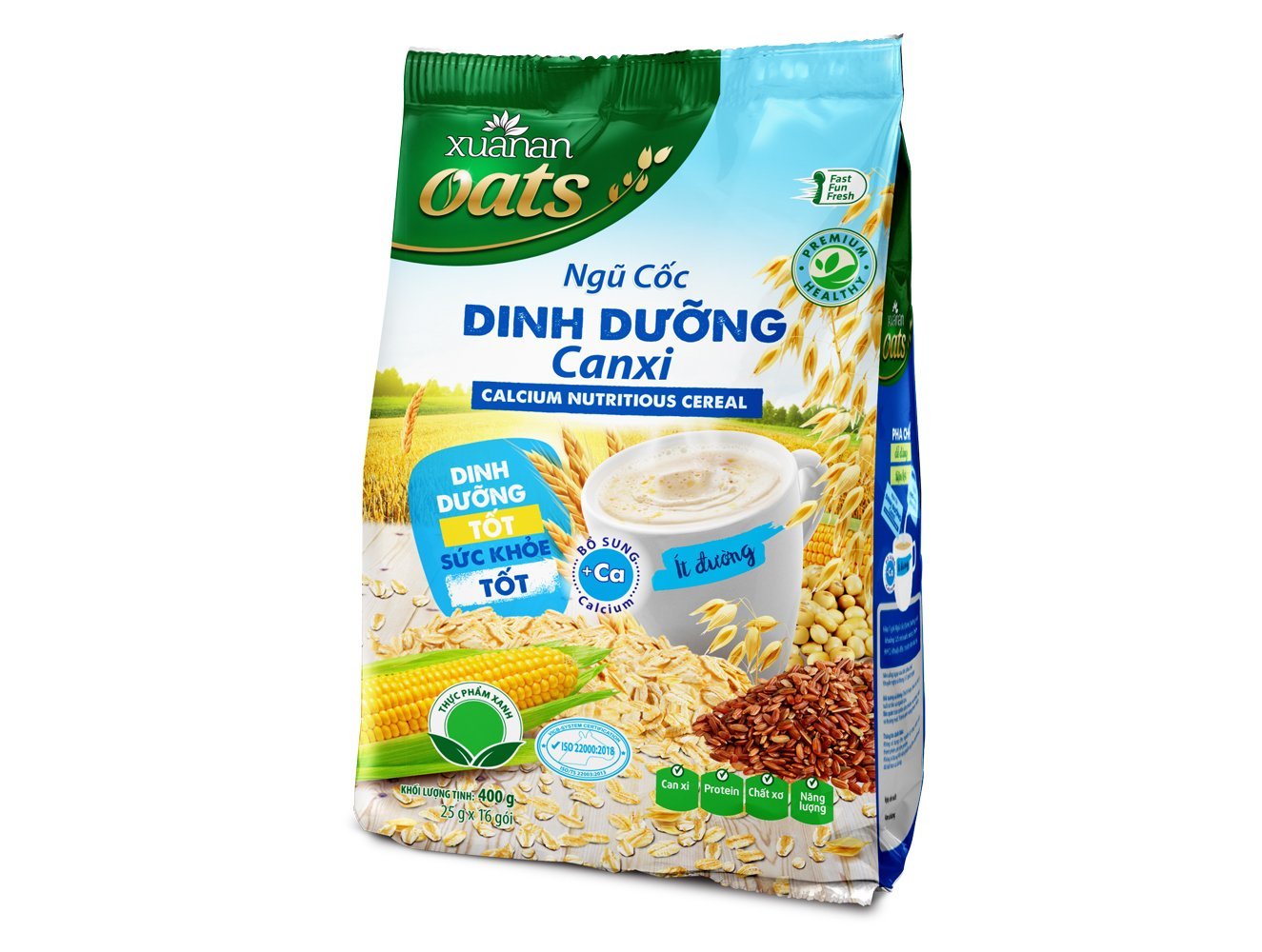 Combo Ngũ Cốc Dinh Dưỡng Canxi ít đường 400G (25G16 GÓI) + Ngũ Cốc Gạo Lứt No Sugar[đường ăn kiêng]400G (25G16 GÓI) Ngũ cốc GẠO LỨT no Sugar là thức uống thơm ngon bổ dưỡng, được làm từ gạo lứt, yến mạch, hạt sen và rất nhiều loại ngũ cốc. Sản phẩm được bổ sung thêm can xi, sử dụng đường ăn kiêng, không sử dụng đường mía. Vitamin, khoáng chất, chất xơ tự nhiên giúp hấp thu dinh dưỡng tốt và thanh lọc cơ thể. Thành phần: Ngũ cốc 60% (bột gạo lứt 10%, yến mạch 6%, đậu đen xanh lòng 3%, nếp cẩm 3%, bắp, đậu nành, gạo, lúa mỳ, lúa mạch), hạt sen 3%, bột kem thực vật, bột dừa, sữa bột tách béo 7% (Instant skim milk powder 7%), Isomalt 3%, Canxi 0.7%, Muối I-ốt, Chất làm dày xanthan gum (E415), chất tạo ngọt (INS 951), chất chống đông vón (E551), Maltodextrin, hương liệu tổng hợp dùng cho thực phẩm. Ngũ cốc DINH DƯỠNG can xi được làm từ rất nhiều loại ngũ cốc bằng công thứ đặc biệt. Sản phẩm được bổ sung Can xi giúp ngăn ngừa loãng xương và sử dụng ít đường. Vitamin, chất xơ và đạm tự nhiên là nguồn dinh dưỡng tốt cho sức khỏe. Thành phần: Ngũ cốc 32% (Yến mạch 10%, bột gạo lứt 5%, bột gạo, bột bắp, bột đậu nành, bột lúa mì, lúa mạch), sữa bột nguyên kem, bột dừa, bột kem thực vật, đường, muối i-ốt, Canxi 0.7%, maltodextrin, chất là dày xanhthan gum (E415), chất chống đông vón (E551), hương liệu tổng hợp dùng cho thực phẩm. 6.75 g đường trong 1 khẩu phần 25g. Đối tượng sử dụng: Trẻ từ 3 tuổi trở lên và người lớn, người ăn theo chế độ giảm đường. Hướng dẫn sử dụng: Hòa 1 gói với khoảng 125ml nước sôi, khuấy đều trước khi dùng. Dùng 2-3 gói mỗi ngày Bảo quản: Bảo quản nơi khô ráo, thoáng mát; tránh tiếp xúc trực tiếp với không khí và ánh nắng mặt trời. Thông tin cảnh báo: Không dùng khi sản phẩm bị rách, mốc hoặc đã hết hạn sử dụng. Sản phẩm của: Công ty TNHH Thực Phẩm Dinh Dưỡng Xuân An