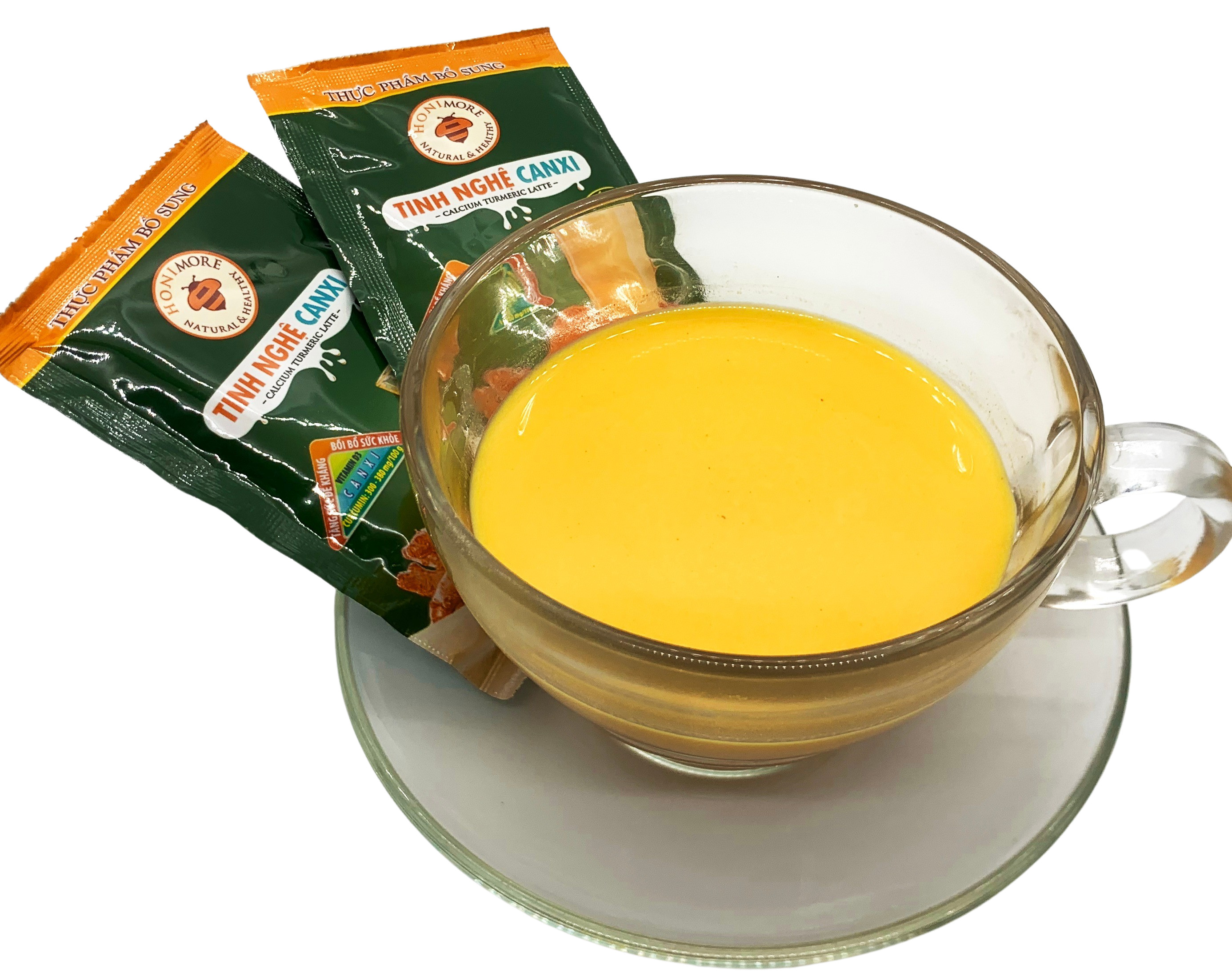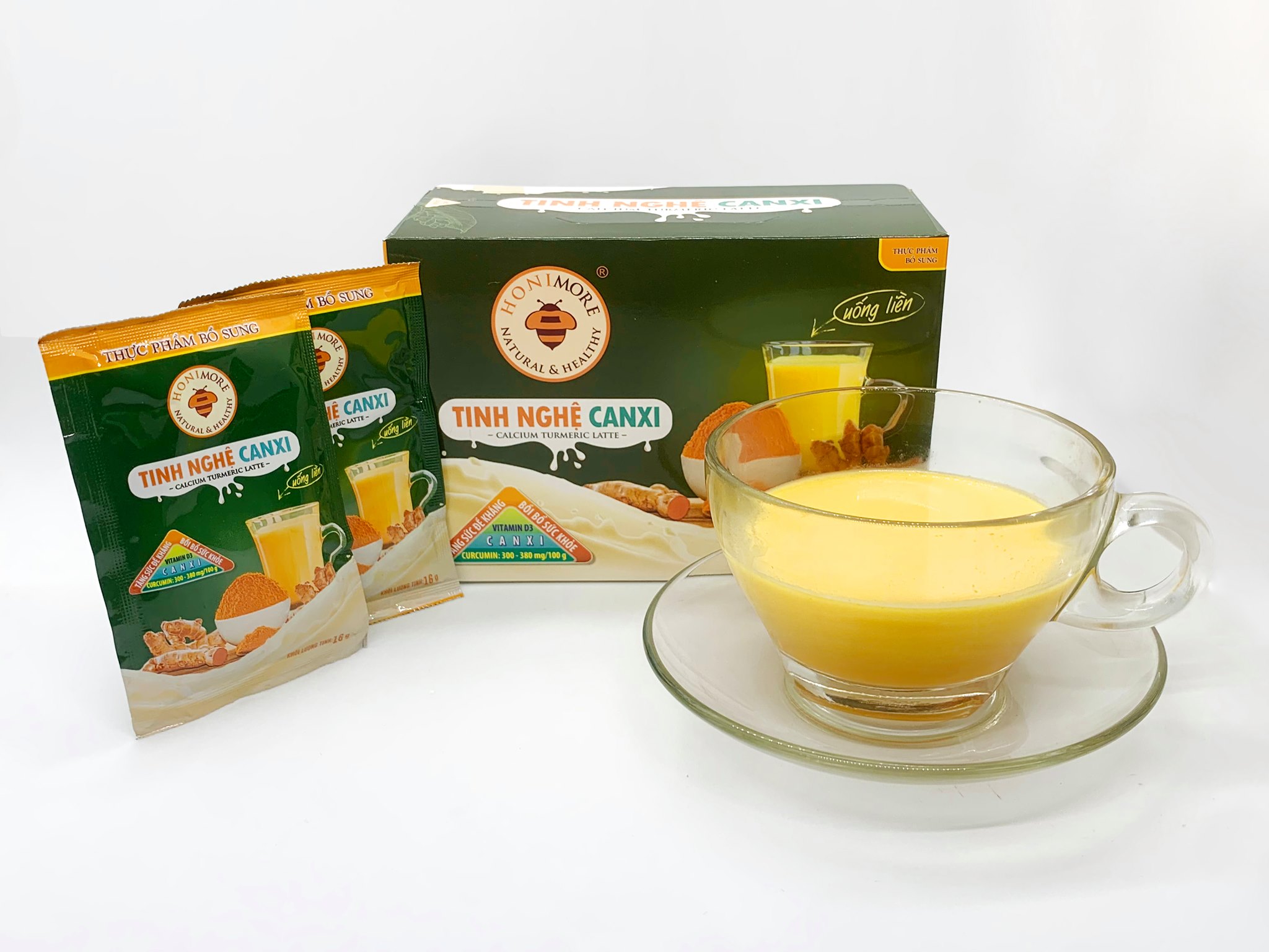 - Tinh nghệ nguyên chất canxi của Honimore là loại tinh bột nghệ nếp vàng giàu curcumin kết hợp hài hòa với bột kem (sữa thực vật) từ tinh dầu cọ thơm ngon, giúp sản phẩm trở nên dễ uống và không có mùi hăng như tinh bột nghệ nguyên chất thông thường.