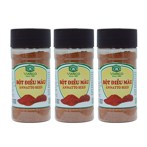 Đặc Tính: Bột điều còn gọi là bột điều màu, bột điều nhộm được trích từ phần vỏ và thịt quả màu đỏ bao quanh hạt của quả điều màu (Điều nhuộm). Chứa nhiều vitamin A, ngoài ra còn có nhiều selenium, magiê, canxi. Là chất tạo màu cho các món ăn, trông ngon miệng hơn. Bột này dùng để thắng với dầu ăn hoặc mỡ. Để lửa riu riu thắng trong vòng 5 phút thì cho ra màu đỏ như màu gạch tôm dùng để nấu các món cà ri, bò kho, bún bò huế, bún riêu cua, bún lạc xá hay quay các loại thịt cho màu đỏ thật đẹp và thơm ngon. Màu điều nhuộm thường được sử dụng trong ẩm thực Châu Mỹ La Tinh và vùng Caribbe để làm chất tạo màu và hương vị. Cây điều nhuộm có nguồn gốc ở Nam Mỹ và đã lan rộng đến nhiều vùng ở Châu Á, nó cũng phát triển ở các vùng nhiệt đới và cận nhiệt đới trên thế giới, bao gồm Trung Mỹ, Châu Phi và Châu Á. Quả hình trái tim có màu nâu hoặc nâu đỏ khi chín, và được bao phủ bởi một lớp lông cứng, thẳng và ngắn. Khi chín hoàn toàn, quả điều sẽ tự tách ra, để lộ nhiều hạt đỏ thẫm bên trong. Bản thân quả thì không ăn được, tuy nhiên phần thịt có màu cam – đỏ bao quanh hạt thì được sử dụng để làm chất tạo màu cho thực phẩm, có màu vàng hoặc đỏ và được làm ra bằng cách nghiền các hạt hay đun sôi trong nước hoặc dầu. Công Dụng: Màu điều nhuộm là một nguồn tocotrienol cao, là những chất chống ôxy hóa có cấu trúc và chức năng tương tự như vitamin E. Các hợp chất tocotrienol từ màu điều nhuộm và các nguồn khác như dầu cọ và cám gạo là chủ đề của các nghiên cứu dinh dưỡng và y học hiện nay, từ khi mà chúng được cho là có khả năng ngăn ngừa ung thư vì hiệu ứng chống tạo mạch của chúng. Hạt điều nhuộm, không giống như cám gạo hay dầu cọ, không chứa bất kỳ hợp chất tocopherol nào, vì thế nó là một nguồn hợp chất tocotrienol tinh khiết tự nhiên. Ở các nước đang phát triển, như Colombia nói riêng, người dân với thu nhập thấp và ít tiếp cận với nguồn y dược hiện đại thường sử dụng các bài thuốc cổ truyền và thuốc thảo dược để điều trị các chứng nhiễm trùng thông thường. Achiote cũng là một trong những loại thảo dược được sử dụng ở Colombia để trị các chứng nhiễm trùng do vi khuẩn. Bên cạnh những lợi ích sức khỏe đã biết có được từ xanthophyll, một loại sesquiterpene hoạt động sinh học có từ achiote cũng thể hiện hoạt tính kháng nấm trung bình. Những đồng phân của norbixin được tìm thấy trong chiết xuất của màu điều nhuộm