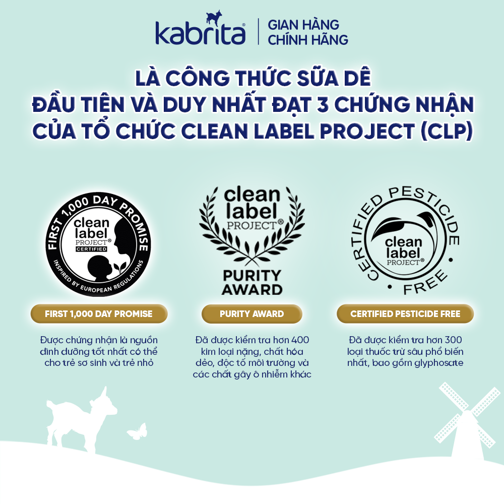 Với hơn 75 năm kinh nghiệm, Kabrita cam kết kiểm soát chặt chẽ từng khâu sản xuất, từ trang trại nuôi dê đến thành phẩm cuối cùng, để mang đến cho bé yêu những sản phẩm dinh dưỡng chất lượng và an toàn nhất.