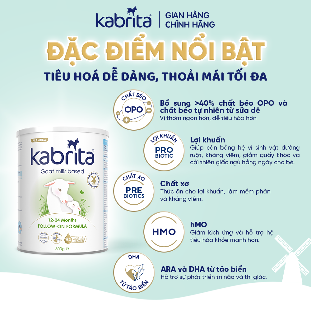 Sản phẩm dinh dưỡng công thức mới sữa dê Kabrita là sự kết hợp hoàn hảo giữa HMO 2'FL, hệ chất xơ GOS:FOS tỉ lệ vàng 9:1 và lợi khuẩn probiotics BB-12, giúp cân bằng hệ vi sinh đường ruột, mang lại cho bé hệ tiêu hóa khỏe mạnh, phân mềm, ít quấy khóc và giấc ngủ sâu hơn.