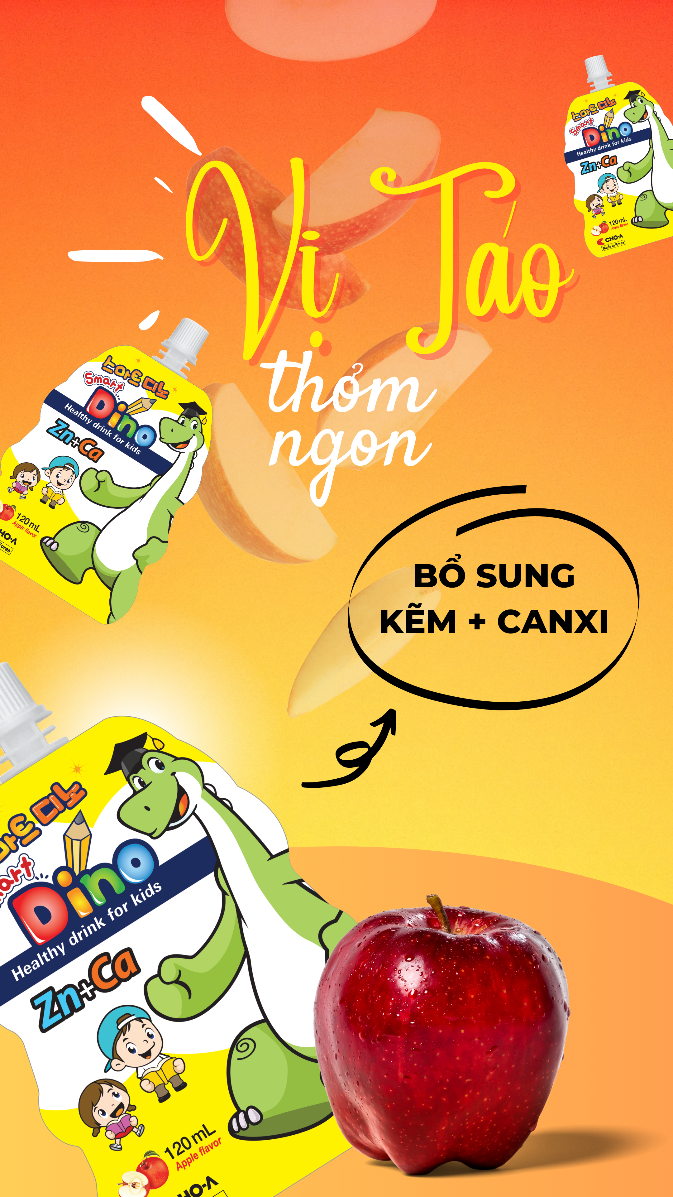 - Smart Dino (Táo) : Bổ sung thêm nhiều canxi và kẽm giúp bé phát triển trí não nhanh hơn,giúp bé ăn khỏe và ngủ ngon, tăng khả năng hấp thu các chất dinh dưỡng