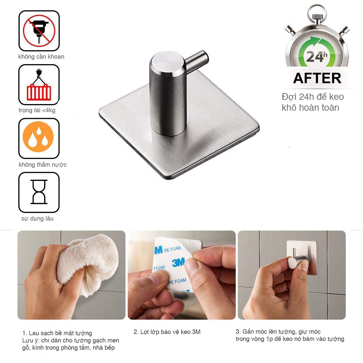 Bộ 4 móc inox dán tường nhựa VIỆT NHẬT - Keo dán 3M siêu dính, chịu lực, treo đồ, quần áo