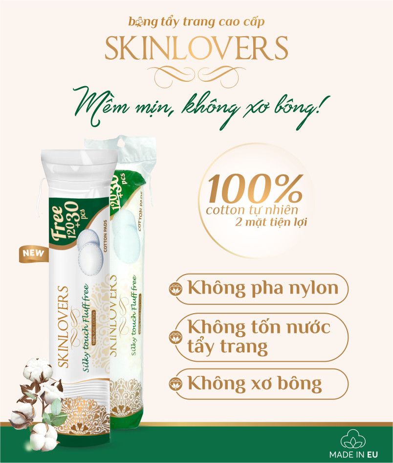 Mô tả sản phẩm: Bông tẩy trang Skinlovers là sản phẩm bông tẩy trang được sản xuất từ 100% bông tự nhiên trên dây chuyền công nghệ hiện đại, chất lượng bông đạt chuẩn EU giúp tẩy trang và làm sạch mọi bụi bẩn bám trên da. Những miếng bông Skinlovers có hình tròn, được dệt thành hai mặt và đóng gói trong túi, có dây rút rất tiện lợi và đảm bảo vệ sinh cho người sử dụng. Đặc biệt, mỗi miếng bông có độ dày vừa phải, được chấm viền mép, rất mềm mịn nhẹ nhàng chăm sóc da, không để lại xơ bông và không gây tốn dung dịch. Với thiết kế sang trọng, bông tẩy trang Skinlovers ngày càng được ưa chuộng với thành phần an toàn, không pha nilon nên an toàn cho mọi loại da, dù là làn da mụn hay da nhạy cảm.