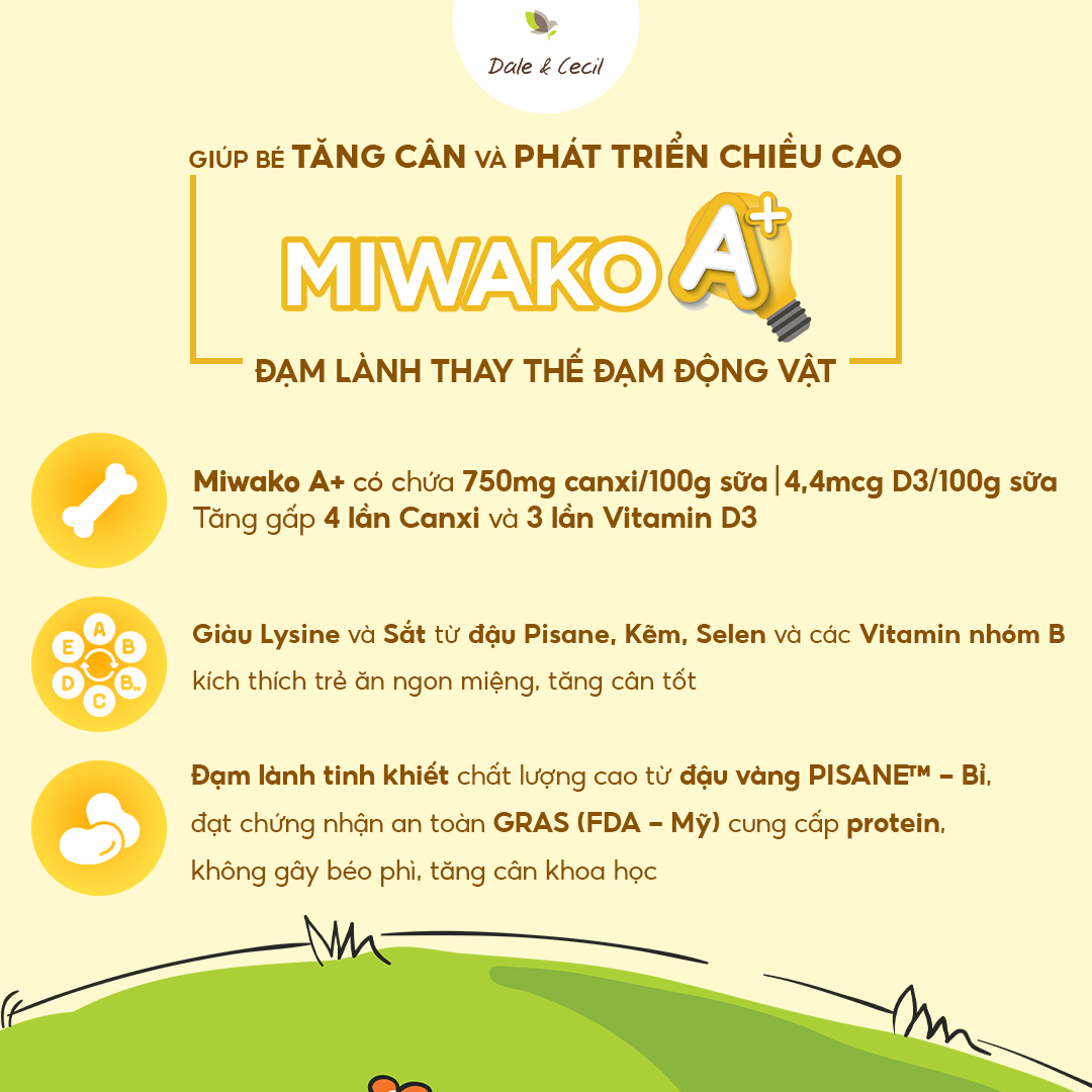- Bộ ba vi chất trong sữa Miwako a+ giúp bé tăng chiều cao vượt trội: canxi, vitamin D3, vitamin K