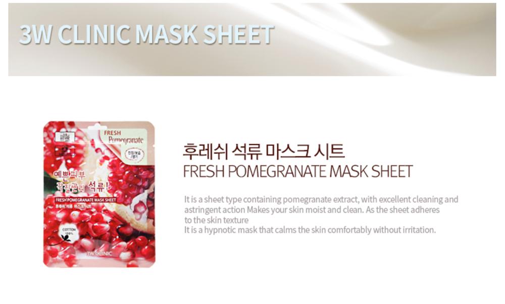 Mặt nạ dưỡng trắng da chống lão hóa chiết xuất lựu 3W Clinic Fresh Pomegranate Mask Sheet 23ml Thương hiệu: 3w Clinic Xuất xứ: Hàn Quốc Dung tích: 23ml/miếng Loại da: Mọi loại da. 3W