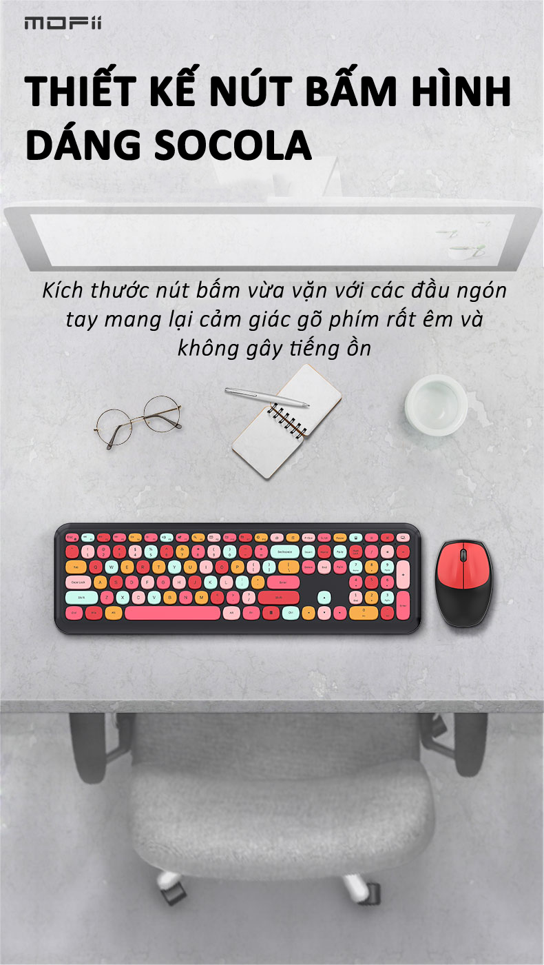 CHỨC NĂNG NỔI BẬT - Bàn phím không dây chính hãng MOFii Ferris hand 666 được thiết kế nút bấm hình dáng socola. - Kích thước nút bấm của bàn phím rất vừa vặn các