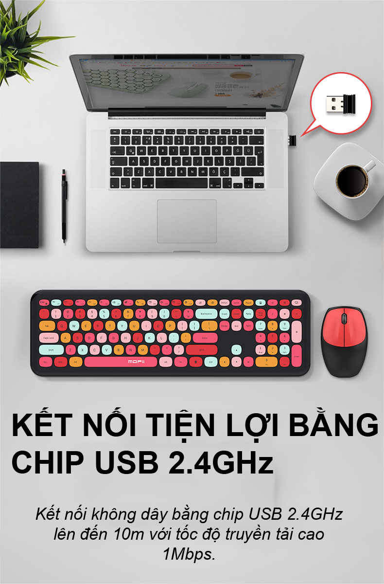 Không dây RF 2.4G: Công nghệ RF 2.4G, phạm vi không dây lên tới 10 mét. Bàn phím thoải mái và yên tĩnh: Bàn phím cấu hình thấp giúp gõ thoải mái. Bàn phím chống tràn: Thiết kế