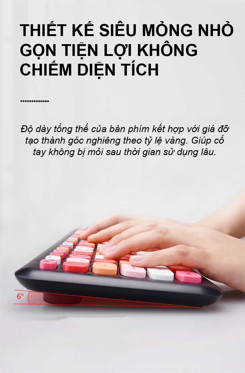 - Độ dày tổng thế của bàn phím kết hợp với giá đỡ tạo thành góc nghiêng theo tỷ lệ vàng. Giúp cổ tay không bị mỏi sau thời gian sử dụng lâu.