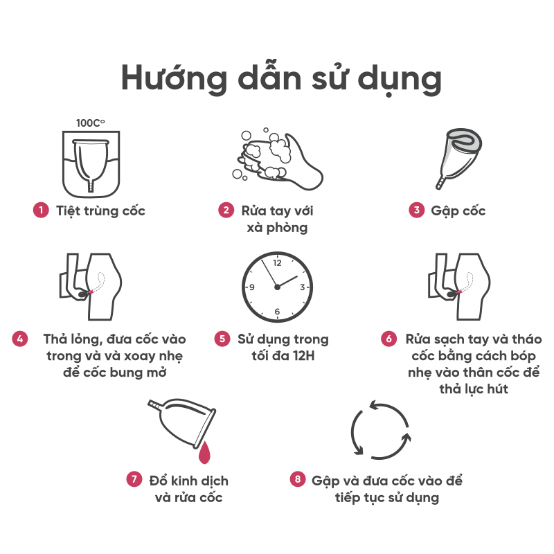 • Trước kỳ: Rửa sạch cốc bằng dung dịch vệ sinh hoặc tiệt trùng bằng bột sủi Lincare để giúp sát khuẩn 99,9% vi khuẩn và nấm trên cốc