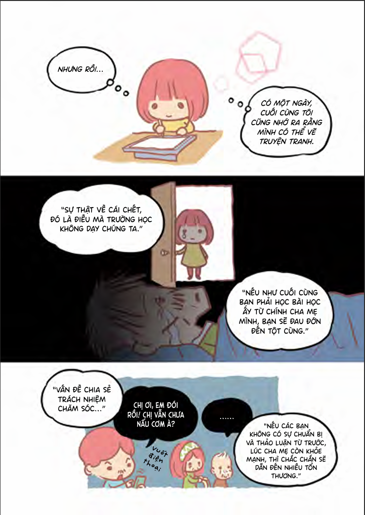Bằng ngòi bút chân thành và sâu sắc, bằng nét vẽ đơn giản nhưng sống động và đầy cảm xúc, tác giả Miew đã truyền tải những cảm xúc mà có lẽ ai trong chúng ta cũng sẽ trải qua trong cuộc đời. Đây không chỉ là một cuốn sách để đọc, mà còn là một món quà tâm hồn dành cho những ai đang và sẽ bước vào hành trình đầy thử thách nhưng cũng vô cùng thiêng liêng này. Khi mở lòng và đón nhận những trang sách này, độc giả sẽ thấy rằng dù cuộc hành trình chăm sóc cuối đời có nhiều khó khăn, nhưng mỗi khoảnh khắc đều chứa đựng tình yêu vô bờ bến và sự trân trọng dành cho những người đã cho ta cuộc sống.