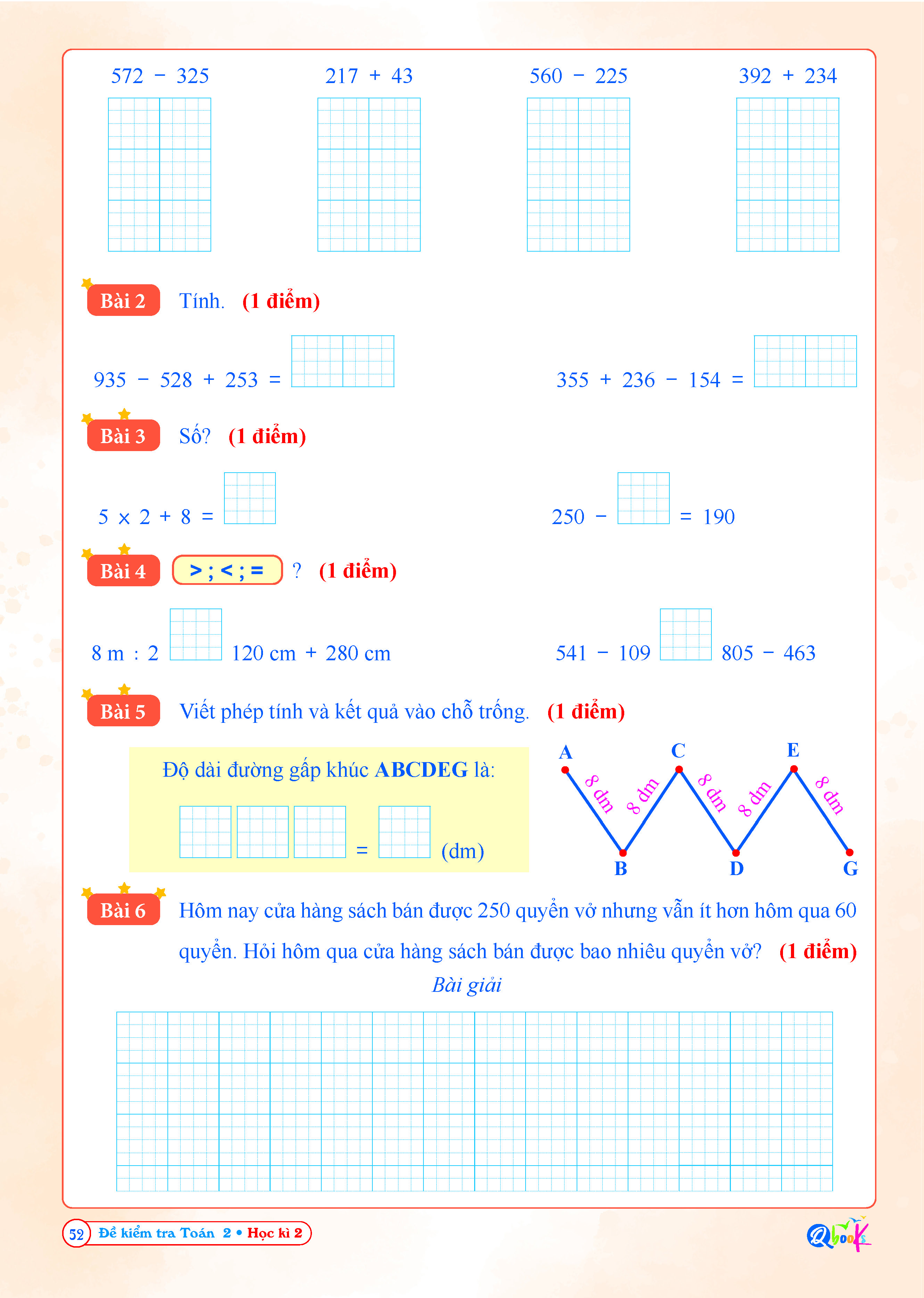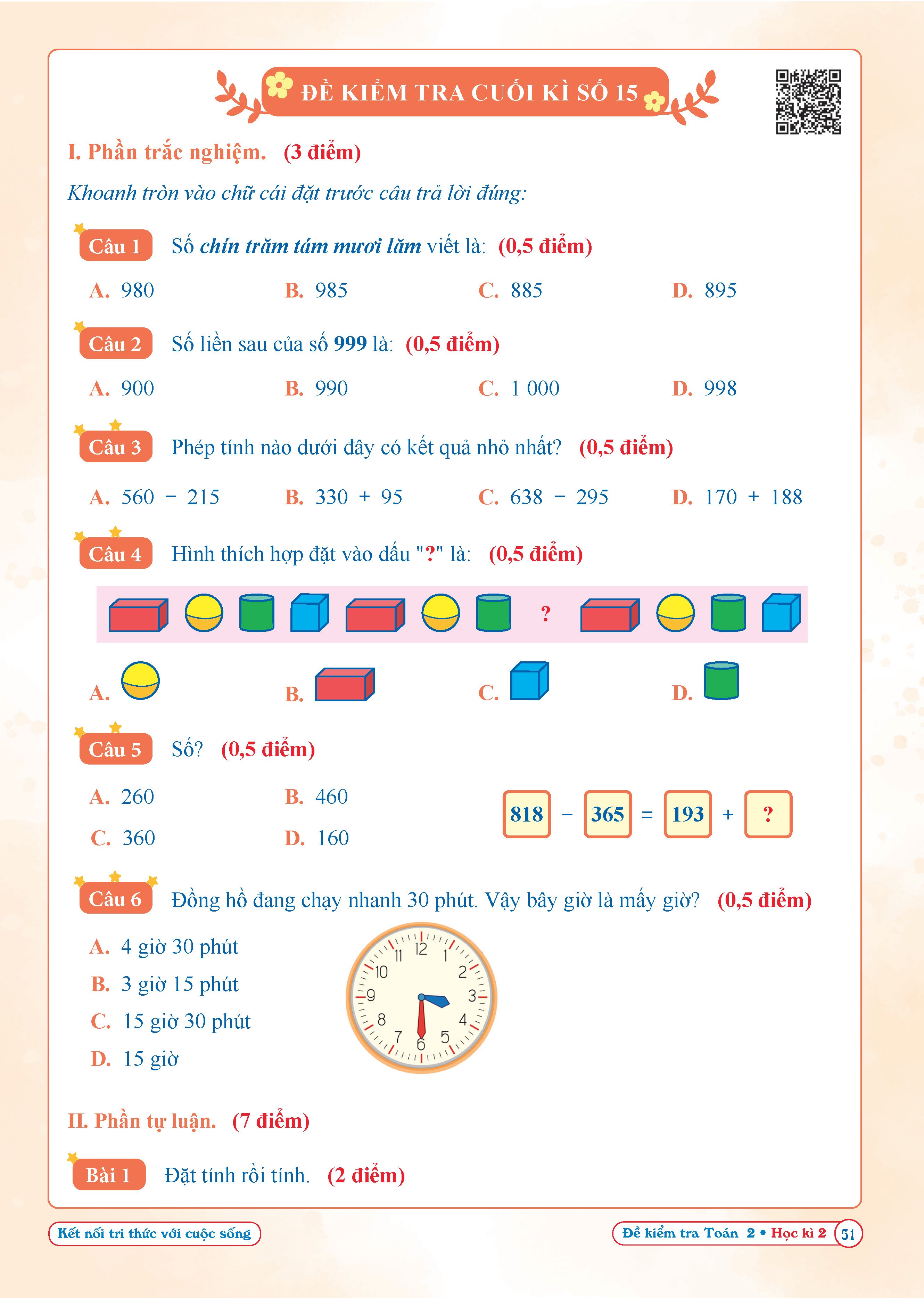 Đề Kiểm Tra Toán, Tiếng Việt Lớp 2 - Kết Nối Tri Thức Giải pháp hoàn hảo cho con tự học ở nhà với lộ trình học, ôn bài, luyện tập và kiểm tra tại nhà rất bài bản và khoa học. Con sẽ nắm chắc kiến thức, thành thạo mọi dạng bài tập để đạt điểm số cao. (Combo gồm 4 quyển Toán và Tiếng Việt, mỗi môn gồm 2 quyển ứng với 2 kỳ học. Bám sát theo chương trình "Kết nối tri thức với cuộc sống") ĐẶC ĐIỂM NỔI BẬT: