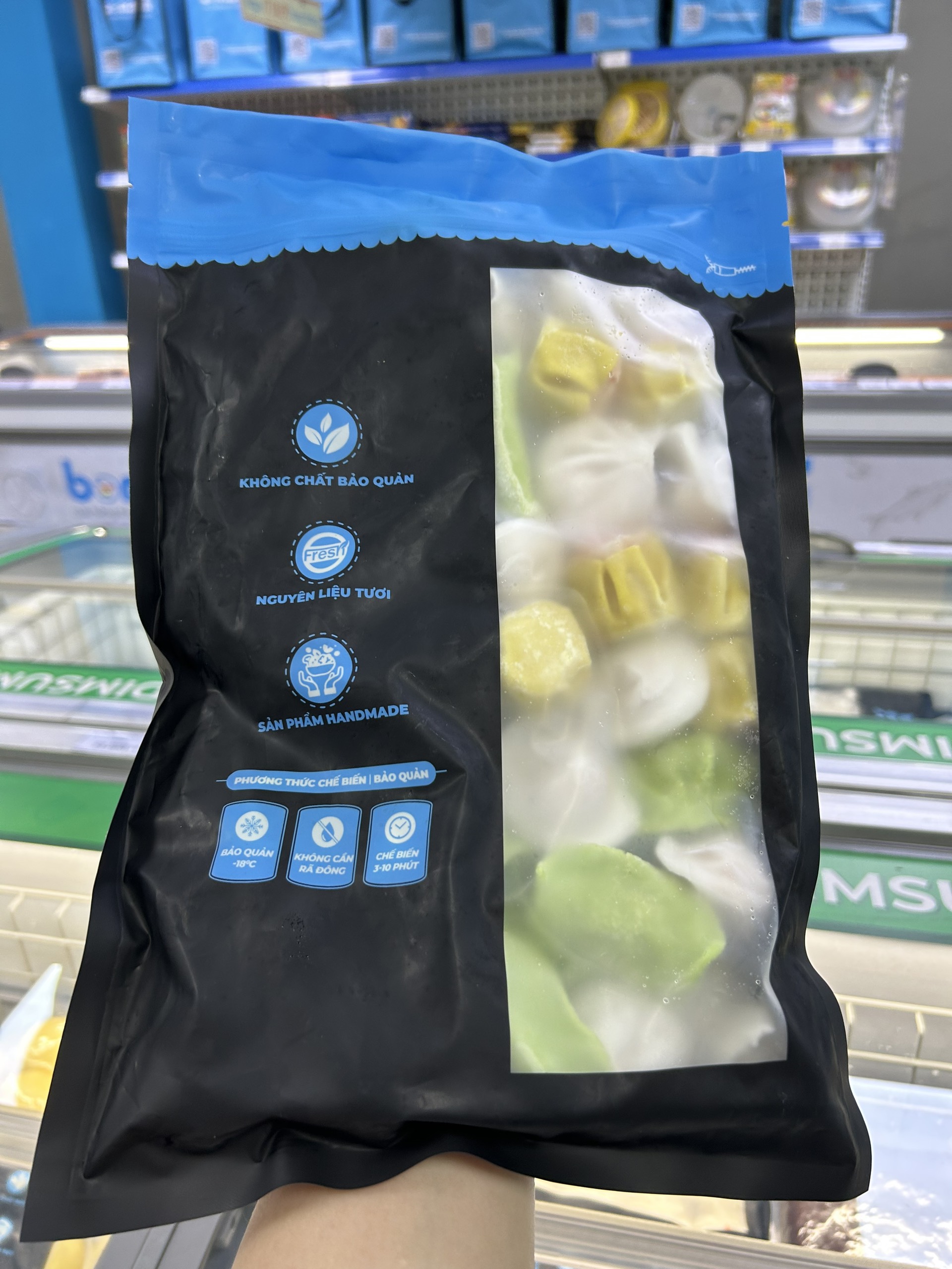 Mua tại TiktokVới sản phẩm tươi sống, trọng lượng thực tế có thể chênh lệch khoảng 10%. ĐỊNH LƯỢNG: 840g/gói THÀNH PHẦN: - Há cảo tôm: (Tôm (45.43 %), mỡ heo, dầu mè, gia vị (muối, tiêu, đường), vỏ bột há cảo) - Há cảo sò điệp: Sò điệp (21 %), tôm (8.5 %), sắn, mảng, hành lá, cà rốt, gia vị (muối, đường, tiêu sọ, dầu hào), vỏ bột mì - Xíu mại tôm: Cá (28.58 %), tôm (17.5 %), dầu nành, dầu mè, gia vị (muối, tiêu, đường), củ năng, măng, cà rốt, bột năng, vỏ bột xíu mại - Há cảo tôm hẹ: Hẹ (18.41%), tôm (18 %), mỡ thắng, hành lá, gia vị (muối, tiêu, đường), vỏ bột há cảo CÁCH CHẾ BIẾN: Không cần rã đông. Hấp ở nhiệt độ 100°C trong thời gian 7-8 phút hoặc bỏ lẩu BẢO QUẢN: Bảo quản nhiệt độ -18°C HSD: 18 tháng