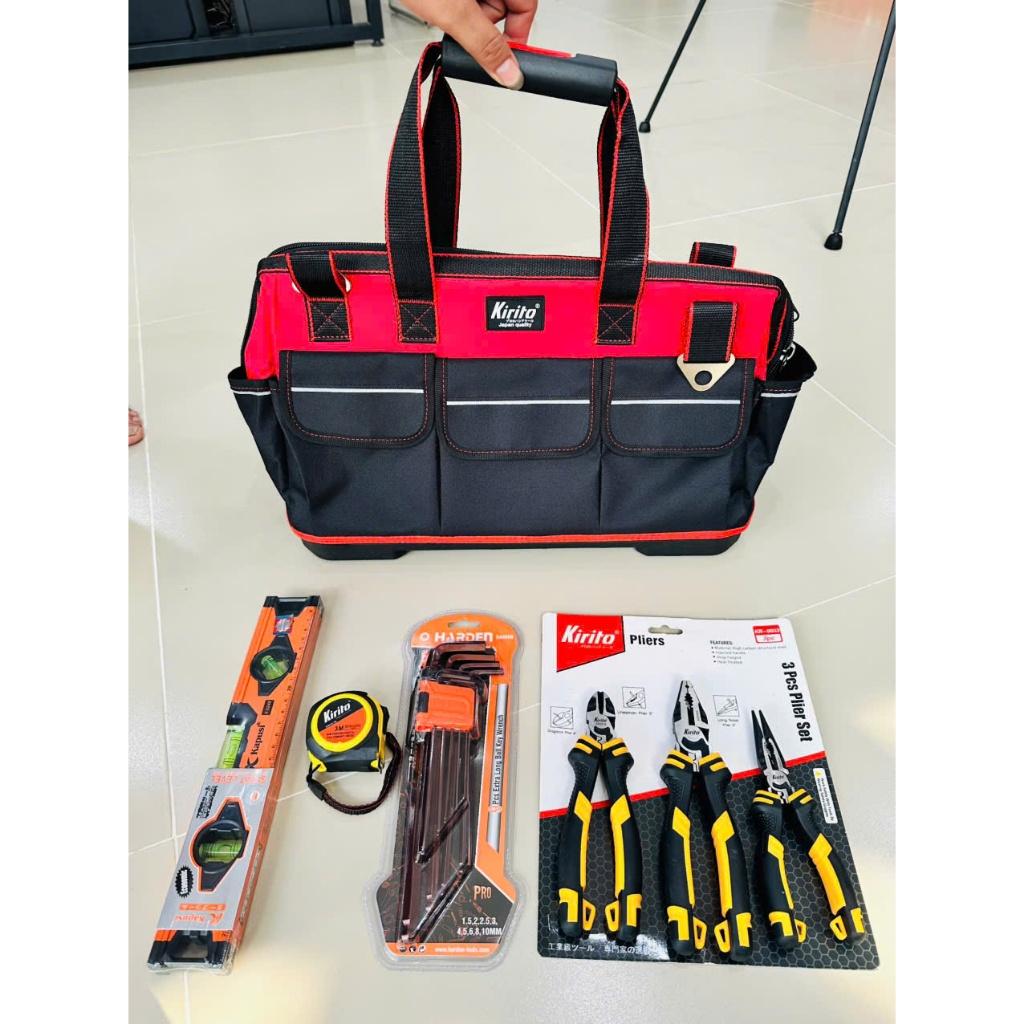COMBO ĐỒ NGHỀ SỬA CHỮA TIỆN LỢI – PHÙ HỢP CHO THỢ & HỘ GIA ĐÌNH Túi đựng đồ nghề 20 inch – Thiết kế rộng rãi, đế nhựa giúp tăng độ bền và giữ dáng túi – Có 8 ngăn bên trong + 8 ngăn bên ngoài, giúp sắp xếp dụng cụ gọn gàng, dễ tìm ️ Bộ kìm CRV Kirito gồm: – Kìm điện 8 inch – Kìm cắt 7 inch – Kìm nhọn 6 inch – Chất liệu thép CRV cứng cáp, phù hợp nhiều công việc cơ bản Bộ lục giác màu nâu dài cao cấp – Thiết kế cầm chắc tay, dễ thao tác Thước cuộn 3m + Thước thủy 30cm – Đầy đủ cho các nhu cầu đo đạc thông thường Sản phẩm phù hợp sử dụng cá nhân hoặc công việc sửa chữa cơ bản