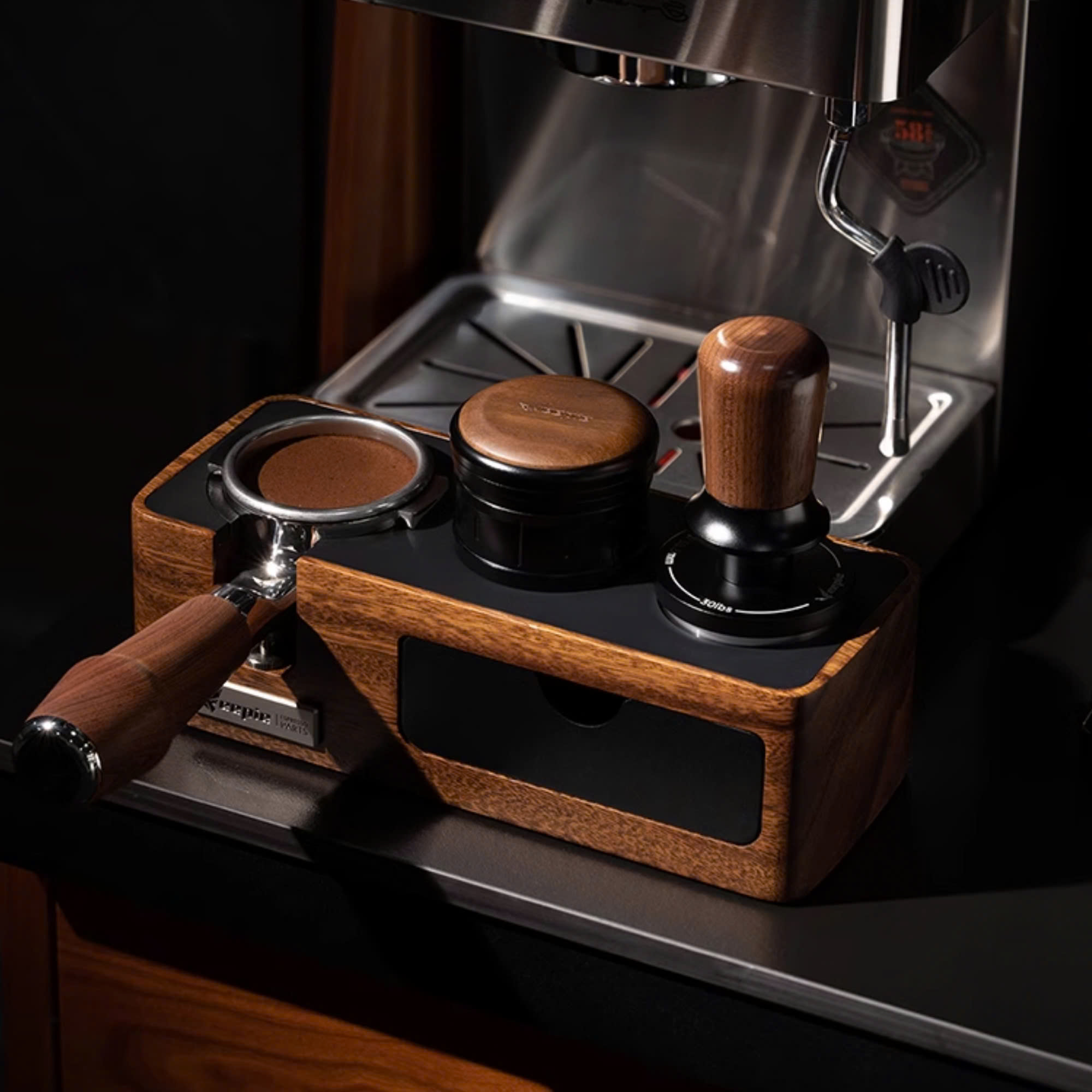 GIÁ ĐỠ TAMPER BẰNG GỖ TỰ NHIÊN PHA CÀ PHÊ MÁY ESPRESSO CAFE DE KONA Khối gỗ được làm bằng 2 loại gỗ: gỗ óc chó đen và gỗ giẻ gai châu âu.