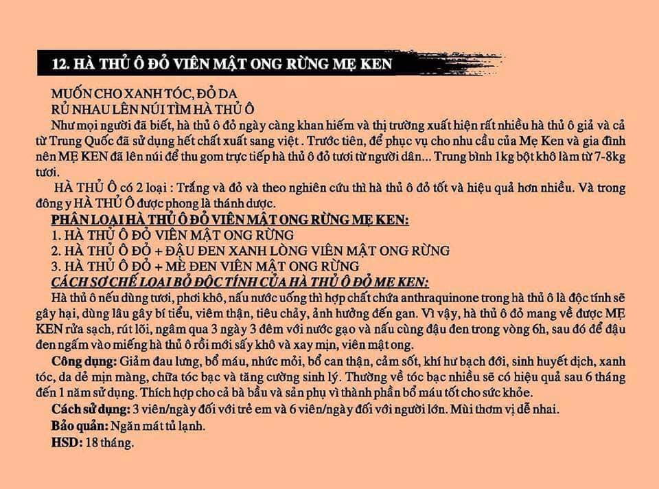 Hà thủ ô nếu dùng tươi, phơi khô, nấu nước uống thì hợp chất chứa anthraquinone trong hà thủ ô là độc tính sẽ gây hạ tiêu chảy dùng lâu gây bí tiểu, viêm thận, tiêu chảy, ảnh hưởng đến gan. Vì vậy, hà thủ ô đỏ mang về được MẸ KEN rửa sạch, rút lõi, ngâm qua 3 ngày 3 đêm với nước gạo và nấu cùng đậu đen trong vòng 6h, sau đó để đậu đen ngấm vào miếng hà thủ ô rồi mới sấy khô và xay mịn, viên mật ong.