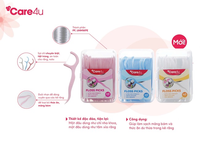 Mua tại TiktokThông số kỹ thuật: Chiều dài sản phẩm: 7,6cm (+-0,2cm), độ dài đầu chỉ: 2,3cm (+-0,2cm) Mô tả sản phẩm: Chỉ kẽ răng Care4u là sản phẩm chăm sóc răng miệng đến từ thương hiệu Care4u. Sản phẩm được thiết kế đặc biệt cho răng và nướu nhạy cảm, sản phẩm tăm chỉ nha khoa sẽ giúp bạn dễ dàng lấy đi các mảng bám trên khe răng- nơi mà bàn chải đánh răng thông thường không len tới được. Sản phẩm được thiết kế tiện lợi, một đầu dùng như chỉ nha khoa, một đầu dùng như tăm xỉa răng. Thiết kế độc đáo với tay cầm từ nhựa cao cấp, an toàn khi sử dụng. Thành phần: PP, UHMWPE Công dụng: