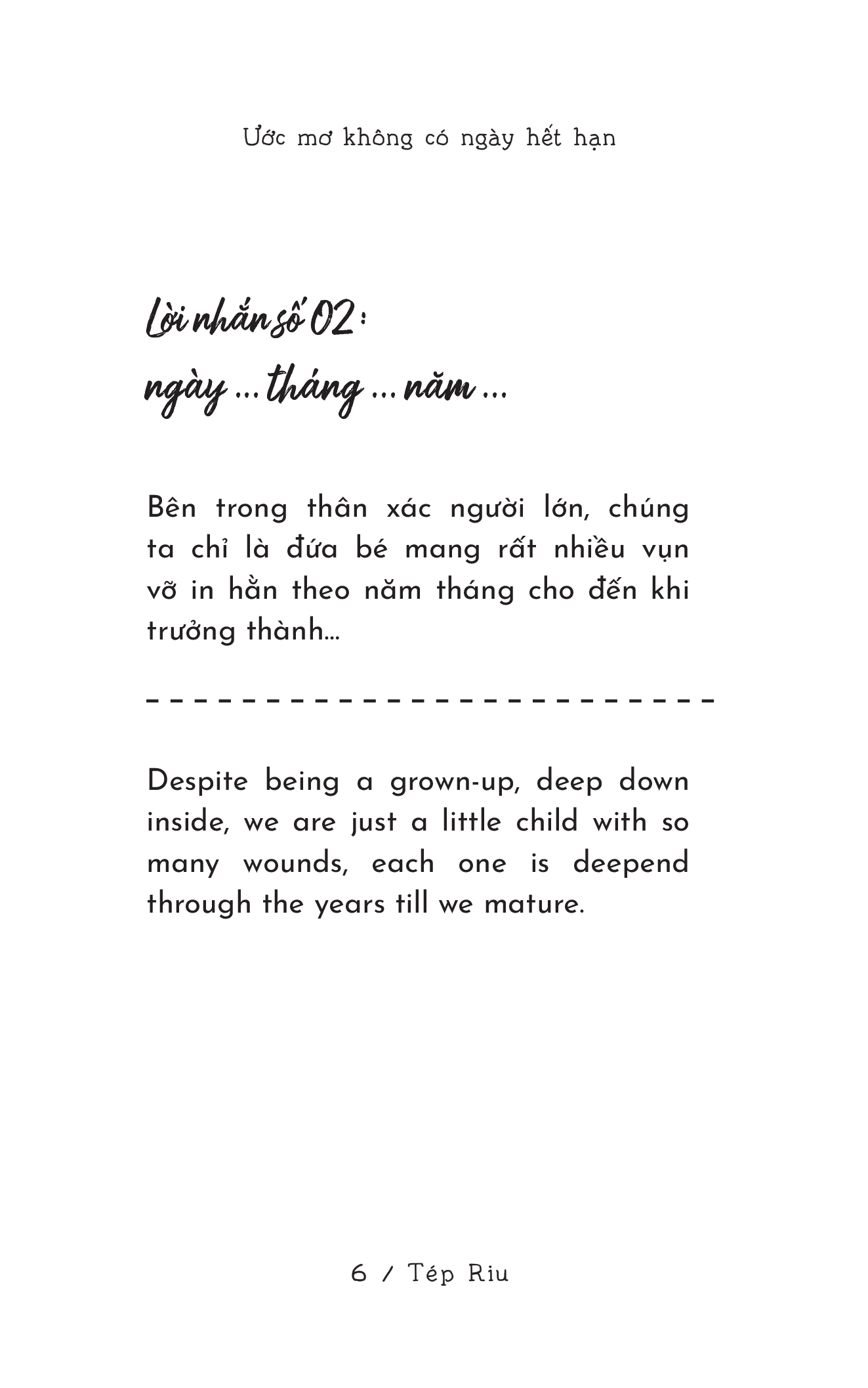 Mua tại TiktokTHÔNG TIN TÁC PHẨM Tên tác phẩm: Just For Youth - Ước Mơ Không Có Ngày Hết Hạn Tác giả: Tép Riu Dịch giả: Quacakydieu Thể loại: Tản văn song ngữ Thương hiệu: Timebooks Nhà xuất bản: NXB Dân Trí Ngôn ngữ: Tiếng Việt – Tiếng Anh Mã ISBN: 978-604-40-7915-8 Loại bìa: Bìa mềm Khổ: 11.5x17 cm Số trang: 200 trang Công ty phát hành: CÔNG TY CỔ PHẦN TIME BOOKS