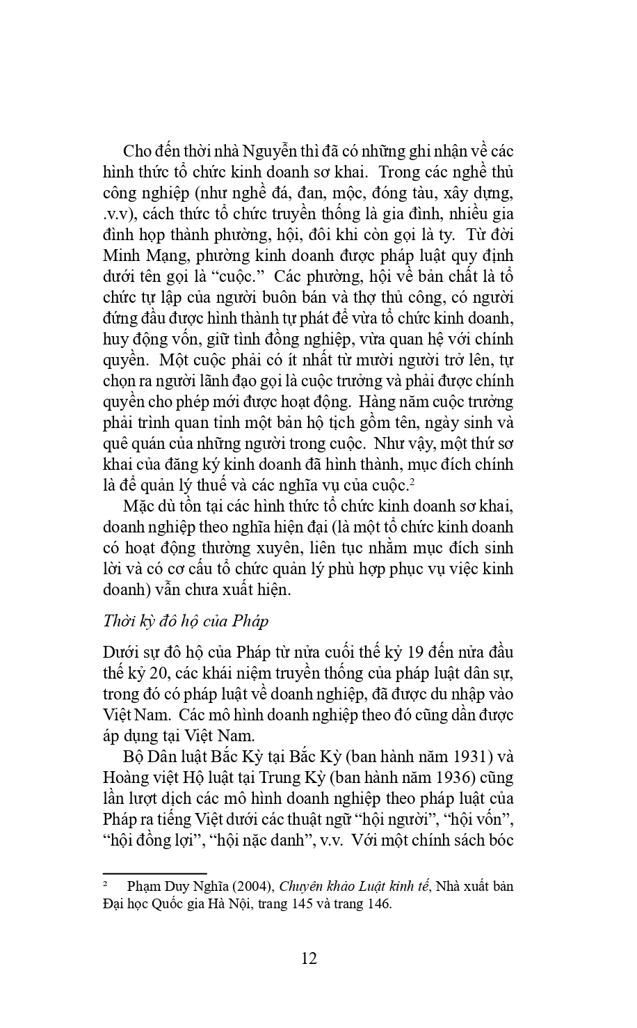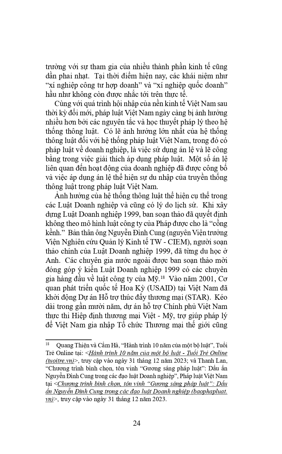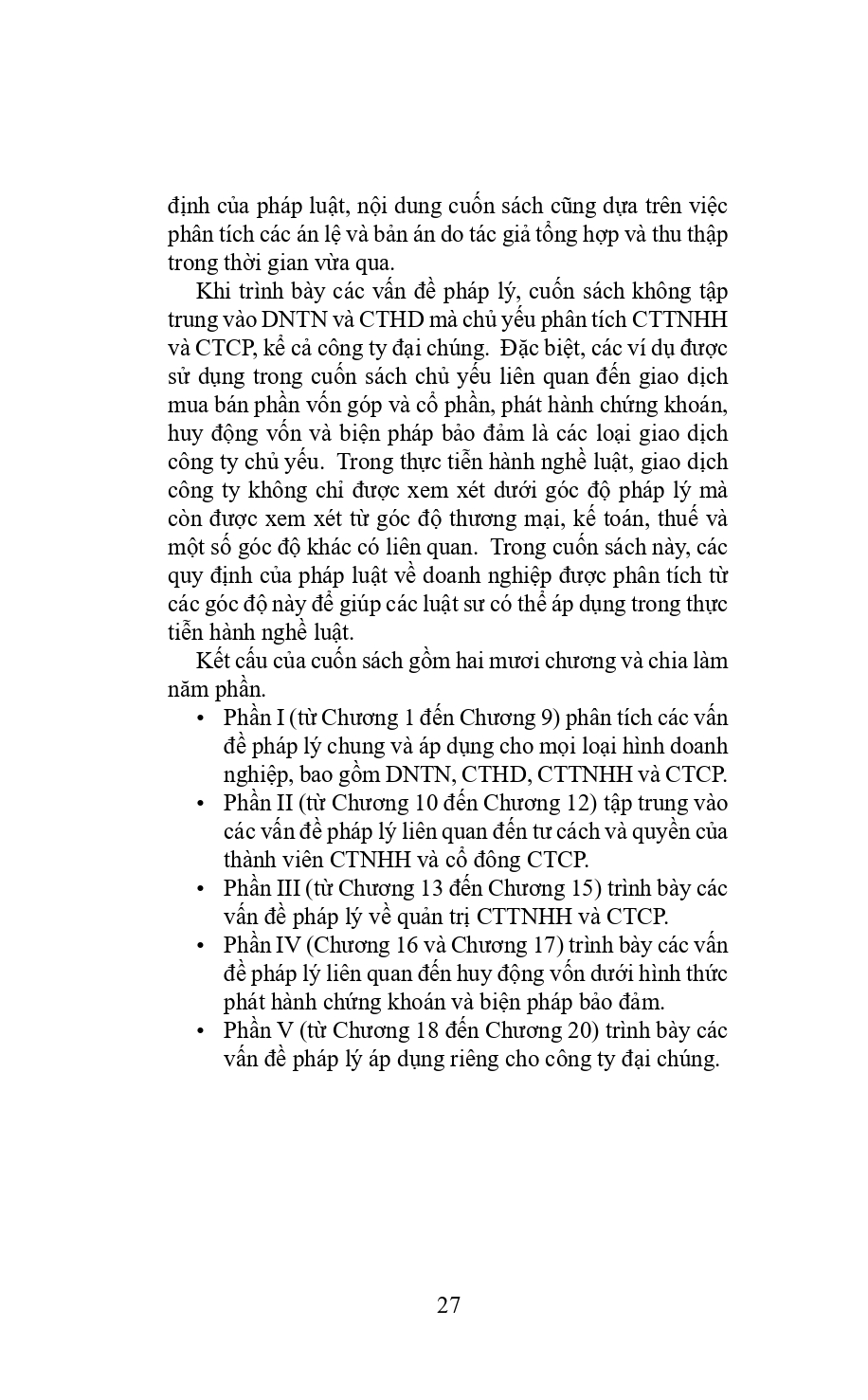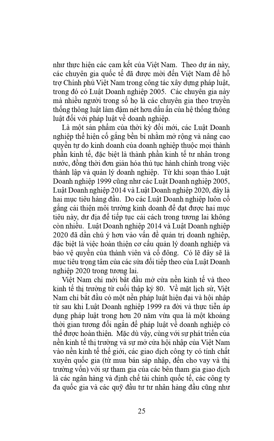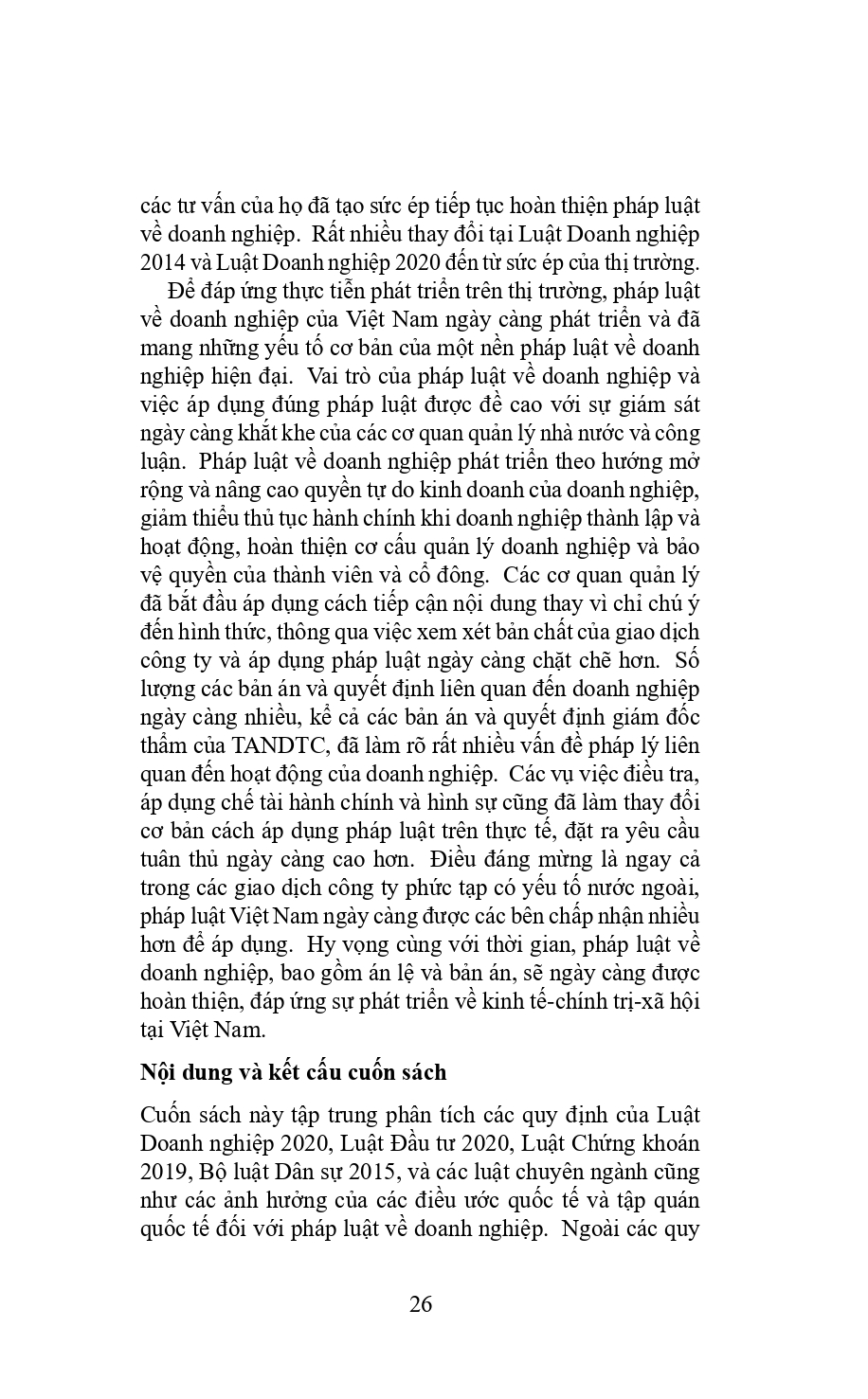 Mua tại Tiktok- Pháp luật về doanh nghiệp – Các vấn đề pháp lý cơ bản (tái bản lần 1 năm 2024) Tác giả: Trương Nhật Quang Nhà xuất bản: Dân Trí Công ty phát hành: Công ty TNHH Sách Á Châu Kích thước: 15.5x 24.5 cm Số trang: 1100 trang Ngày phát hành: 3.2024 Hình thức bìa: Bìa mềm Giá bìa: 900.000 đ Lời giới thiệu: Cuốn sách đầu tiên nghiên cứu một cách có hệ thống các vấn đề pháp luật về doanh nghiệp của Việt Nam từ cả góc độ lý thuyết và thực tiễn, tập trung vào các giao dịch mua bán doanh nghiệp và tài chính-ngân hàng có yếu tố nước ngoài dựa trên kinh nghiệm hành nghề thực tế của luật sư Trương Nhật Quang. Công ty luật YKVN nơi tác giả làm việc là một trong các công ty luật hàng đầu Việt Nam và tham gia tư vấn trong nhiều giao dịch giao dịch mua bán doanh nghiệp và tài chính-ngân hàng có yếu tố nước ngoài quan trọng nhất trên thị trường. Đây là ấn bản sửa đổi lần đầu của cuốn sách được luật sư Trương Nhật Quang xuất bản năm 2016. Được viết trong trong 4 năm qua, cuốn sách cập nhập các thay đổi luật từ năm 2016, đặc biệt là Luật Doanh nghiệp năm 2020, Luật Đầu tư năm 2020, Luật Chứng khoán năm2019, Bộ luật Hình sự năm 2015 (được sửa đổi, bổ sung năm 2017) và nhiều văn bản pháp luật quan trọng khác. Do vậy, nội dung cuốn sách gần như được cập nhật lại mới hoàn toàn để phân tích khung pháp lý mới đang áp dụng tại thời điểm hiện nay. Ngoài việc phân tích các văn bản pháp luật, cuốn sách cũng phân tích các án lệ và nhiều bản án, quyết định và phán quyết của tòa án và trọng tài mà tác giả đã sưu tầm trong thời gian qua. Đặc biệt cuốn sách phân tích rất nhiều bản án phúc thẩm và giám đốc thẩm của các tòa án tại Hà Nội, Đà Nẵng và Thành phố Hồ Chí Minh và Tòa án Nhân dân Tối cao. Do vậy, nhiều vấn đề pháp lý cơ bản trình bày trong cuốn sách được phân tích từ góc độ thực tiễn xét xử tại tòa án. Cuốn sách bao gồm nhiều sơ đồ và bảng tóm tắt để giúp người đọc dễ hiểu hơn các vấn đề pháp lý và cơ cấu giao dịch được trình bày trong cuốn sách. Ngoài ra, để giúp người đọc tiện tra cứu, cuốn sách có (i) bảng tra cứu từ khóa, (ii) bảng tra cứu án lệ, bản án và quyết định và (iii) danh sách các tài liệu trích dẫn. Trải dài trong hơn 1000 trang, cuốn sách phân tích các vấn đề pháp lý cơ bản liên quan đến việc thành lập, tổ chức quản lý và hoạt động của doanh nghiệp. Kết cấu của cuốn sách gồm hai mươi chương và chia làm năm phần, tập trung vào hai hình thức doanh nghiệp thông dụng nhất là công ty trách nhiệm hữu hạn (CTTNHH) và công ty cổ phần (CTCP). • Phần I (từ Chương 1 đến Chương 9) phân tích các vấn đề pháp lý chung và áp dụng cho mọi loại hình doanh nghiệp. • Phần II (từ Chương 10 đến Chương 12) tập trung vào các vấn đề pháp lý liên quan đến tư cách và quyền của thành viên CTNHH và cổ đông CTCP. • Phần III (từ Chương 13 đến Chương 15) trình bày các vấn đề pháp lý về quản trị CTTNHH và CTCP. • Phần IV (Chương 16 và Chương 17) trình bày các vấn đề pháp lý liên quan đến huy động vốn dưới hình thức phát hành chứng khoán và biện pháp bảo đảm. • Phần V (từ Chương 18 đến Chương 20) trình bày các vấn đề pháp lý áp dụng riêng cho công ty đại chúng. Cuốn sách được viết chủ yếu dành cho luật sư, người tham gia công tác giảng dạy, sinh viên luật và người quản lý doanh nghiệp mong muốn tìm hiểu các vấn đề pháp lý về doanh nghiệp. Đặc biệt, cuốn sách giúp các luật sư hành nghề có thể tham khảo khi tư vấn trong các giao dịch doanh nghiệp, đặc biệt là các giao dịch mua bán doanh nghiệp và tài chính-ngân hàng có yếu tố nước ngoài.