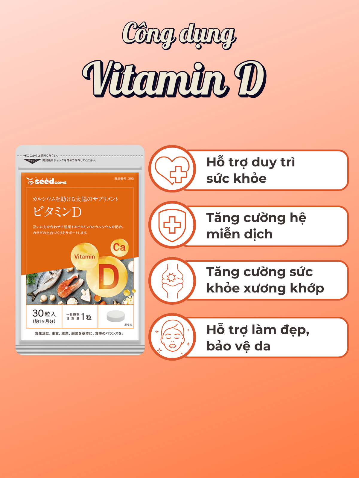 - Viên Uống Vitamin D Hỗ Trợ Tăng Cường Sức Khỏe Xương Khớp Và Hệ Miễn Dịch Seedcoms Nhật Bản Gói 30 Viên THÀNH PHẦN CỦA VIÊN UỐNG VITAMIN D: Xi-rô tinh bột mạch nha khử (sản xuất trong nước), Dextrin/cellulose tinh thể, Canxi động vật có vỏ, Calcium stearate, Silicon dioxide hạt mịn, Vitamin D QUY CÁCH & HDSD SẢN PHẨM: Số lượng viên/gói: 30 viên/gói Hạn dùng: hạn sử dụng được in trên bao bì sản phẩm. Liều lượng: Uống 1 viên/ngày