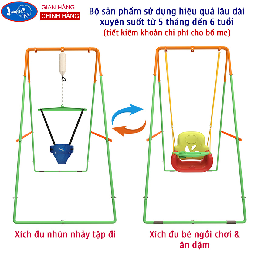- Bộ Combo đa năng tiện dụng gồm: xích đu nhún nhảy tập đi (bộ cao cấp có thêm 2 thanh ngang dưới chân giúp khung cứng chắc hơn) + ghế xích đu tích hợp bàn ăn dặm cho bé chơi từ 4 - 5 tháng (cứng cổ là chơi được) cho đến 6 tuổi, tiết kiệm khoản chi phí đáng kể cho bố mẹ.