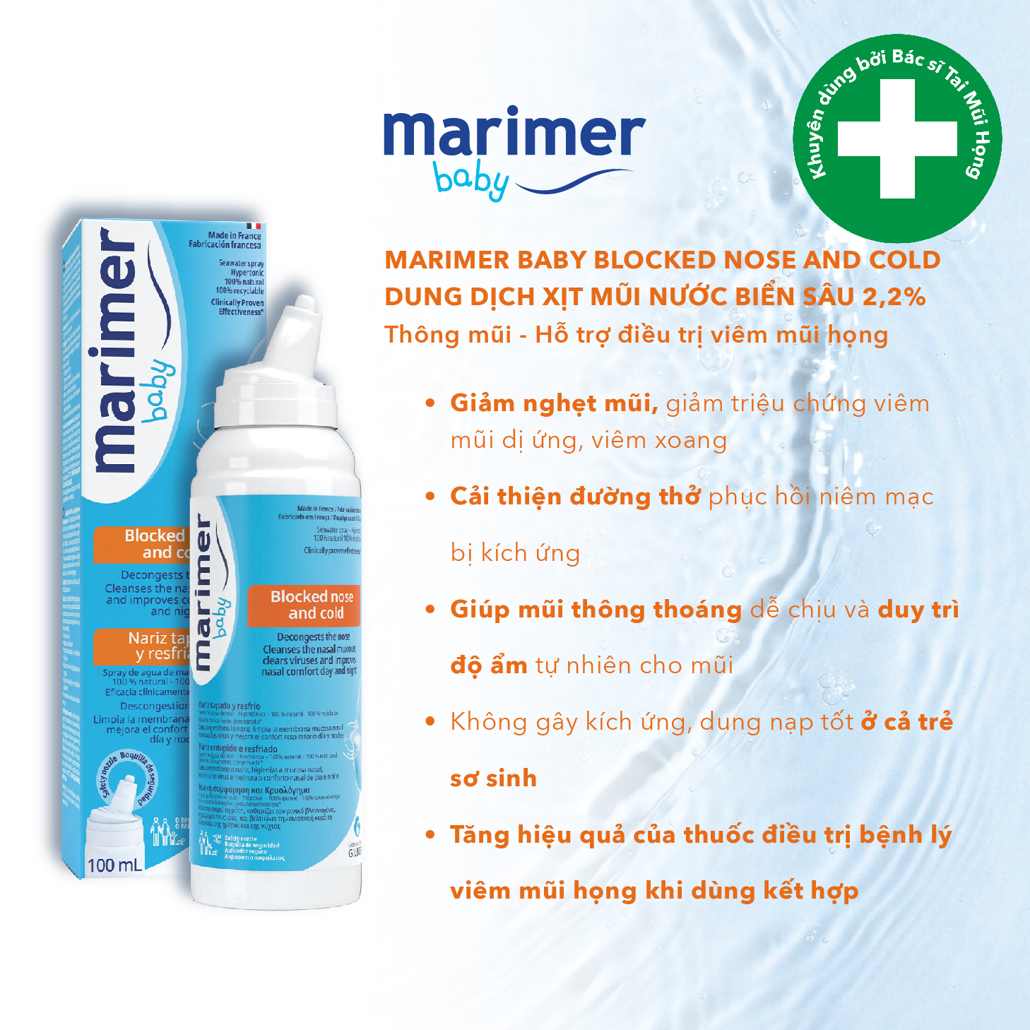 Combo nước biển sâu Marimer Baby Blocked + Gel tắm 3in1 Neutraderm Combo nước biển sâu Marimer Baby Blocked + Gel tắm 3in1 Neutraderm Gel Tắm Gội Cho Bé 3 Trong 1 NEUTRADERM Làm Sạch Dịu Nhẹ An Toàn Cho Da Bé chứa phức hợp hoạt tính Active Oligo Skin Complex chiết xuất từ nước biển IROISE không chỉ làm sạch dịu nhẹ mà còn cung cấp độ ẩm cần thiết bảo vệ làn da mỏng manh của bé. THÔNG TIN SẢN PHẨM Sữa Tắm Cho Bé 3 Trong 1 NEUTRADERM Công dụng: - Tạo màng bảo vệ trên da bé, giúp kháng khuẩn và bảo vệ làn da mỏng manh của bé khỏi các ảnh hưởng từ môi trường như bụi bẩn, ánh nắng, kể cả da đầu - 100% Tôn trọng làn da bé - Không gây khô da sau khi tắm - Không cay mắt - Công thức dung nạp cao. Loại da: Phù hợp với mọi loại da (kể cả da nhạy cảm). 2. MARIMER BABY BLOCKED NOSE AND COLD Dung dịch xịt mũi làm thông mũi, giảm nghẹt mũi, hỗ trợ điều trị cảm cúm, viêm mũi họng Dành cho trẻ sơ sinh THÀNH PHẦN: Nước biển ưu trương, nước tinh khiết. CHỈ ĐỊNH: Dành cho trẻ sơ sinh, khi có các triệu chứng bệnh lý tai mũi họng: - Thông mũi, loại bỏ dịch nhầy bẩn, virus, vi khuẩn và tác nhân dị ứng, - Giảm các triệu chứng: nghẹt mũi, ngứa mũi, viêm mũi dị ứng, viêm xoang, cảm cúm. - Cải thiện đường thở và phục hồi niêm mạc mũi bị kích ứng. - Tăng