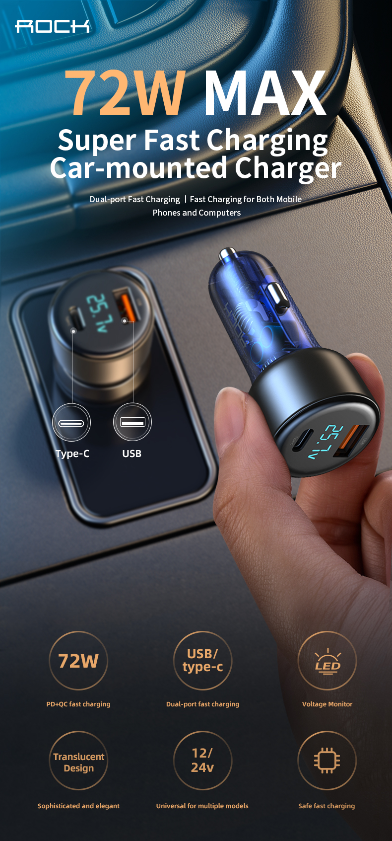 - Củ sạc nhanh trên xe hơi Rockspace H16 hỗ trợ sạc nhanh tối đa 72w. Tổng công suất 2 cổng( usb và typeC) 72w hỗ trợ sạc siêu nhanh cho hầy hết điện thoại di động