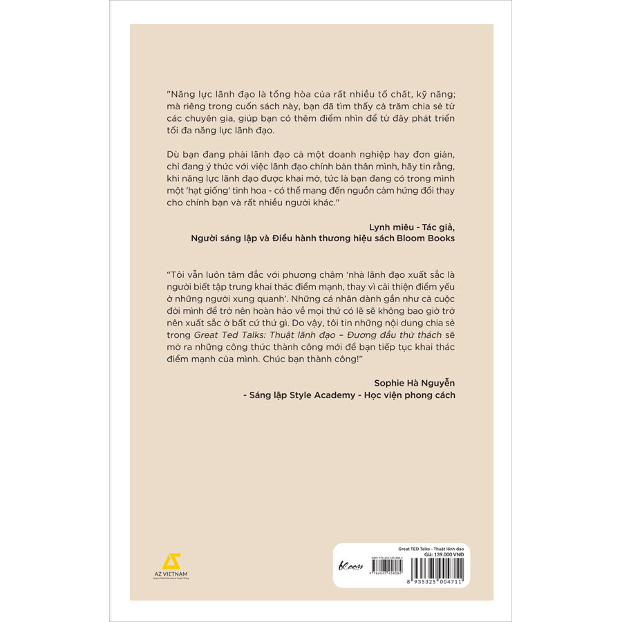 "Năng lực lãnh đạo là tổng hòa của rất nhiều tố chất, kỹ năng; mà riêng trong cuốn sách này, bạn đã tìm thấy cả trăm chia sẻ từ các chuyên gia, giúp bạn có thêm điểm nhìn để từ đây phát triển tối đa năng lực lãnh đạo.