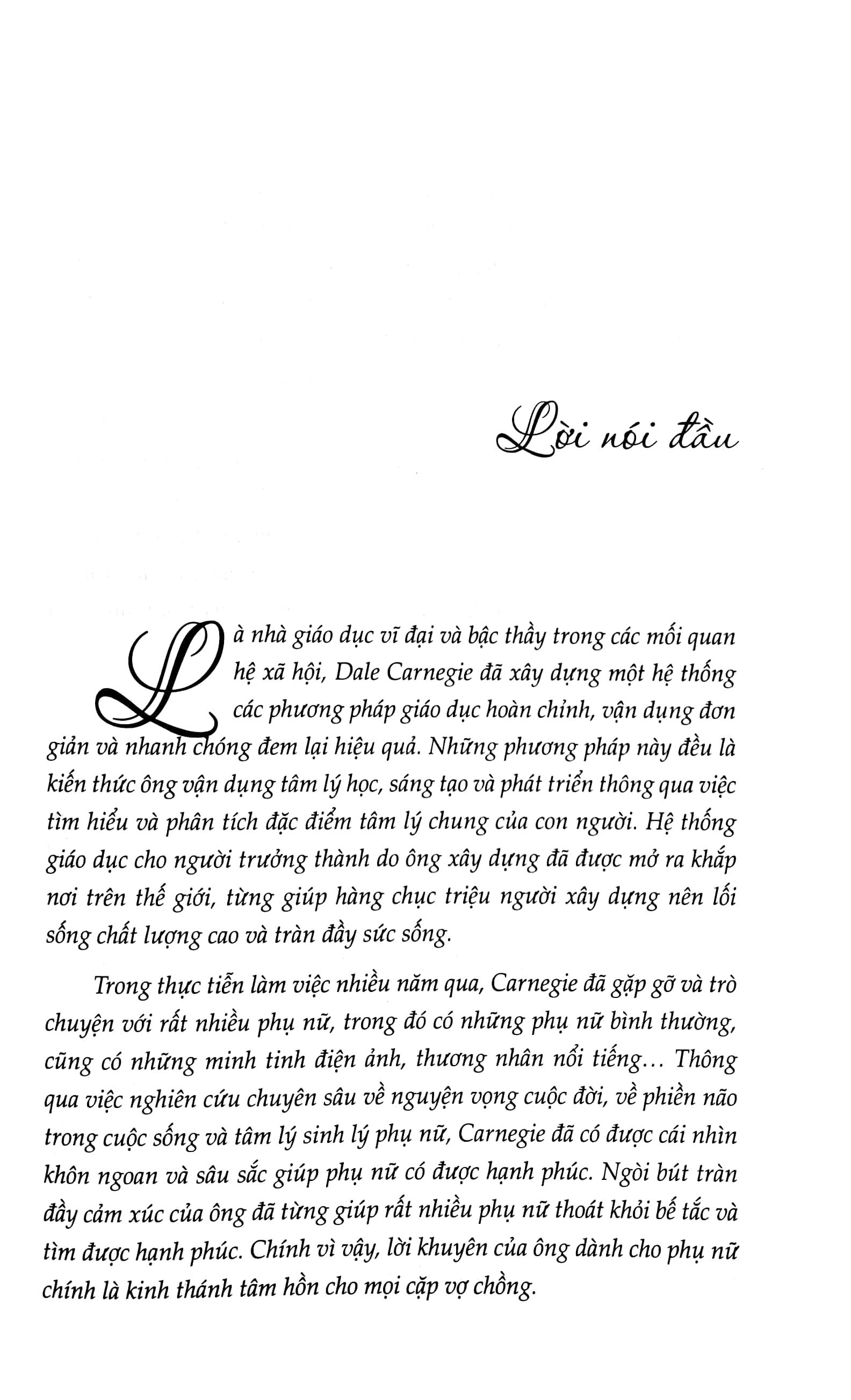 Dale Carnegie đã phân tích lý luận sâu sắc và đưa ra rất nhiều hành động cụ thể làm quy tắc và hướng dẫn. Tư tưởng và sự hiểu biết của ông rất sâu sắc, đồng thời cũng rất thực tế, dành cho tất cả phụ nữ, kể cả phụ nữ chưa kết hôn lẫn phụ nữ đã lập gia đình. Bất kể là ai, chỉ cần vận dụng thông minh và linh hoạt các phương pháp này, cô ấy có thể vượt qua mọi trở ngại trên con đường tìm kiếm hạnh phúc để có được một cuộc đời hạnh phúc, vui vẻ, như ý.