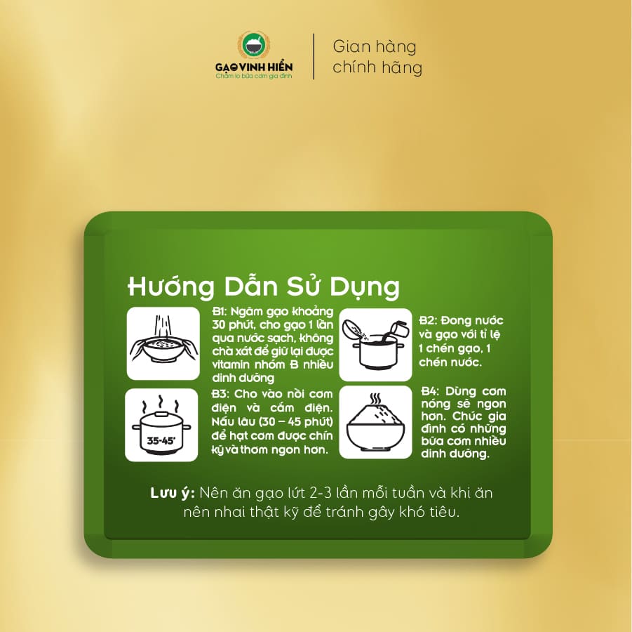- Cơm nấu lên có mùi thơm, ngon ngọt tự nhiên, đặc biệt giàu vitamin, chất xơ và khoáng chất CÁCH NẤU Ngâm gạo 30 - 60 phút trước khi nấu Sau khi ngâm, vo gạo khoảng 2, 3 lần để làm sạch 1 chén gạo cho 1 - 1.5 chén nước Nấu trong vòng 30 - 45 phút BẢO QUẢN Để nơi khô ráo, thoáng mát, tránh ánh nắng trực tiếp