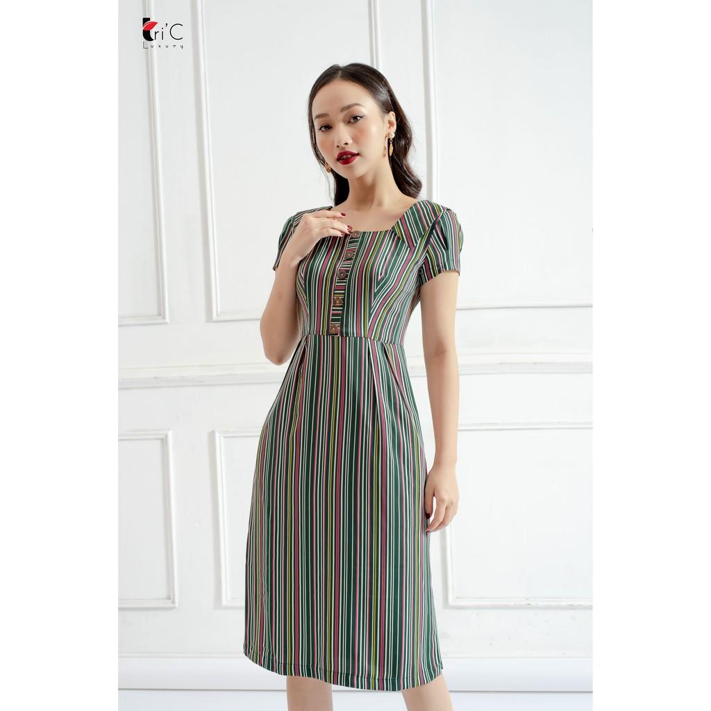 ✨Đầm chữ A Tri'C Luxury kẻ sọc cổ vuông Xanh kẻ sọc A16320