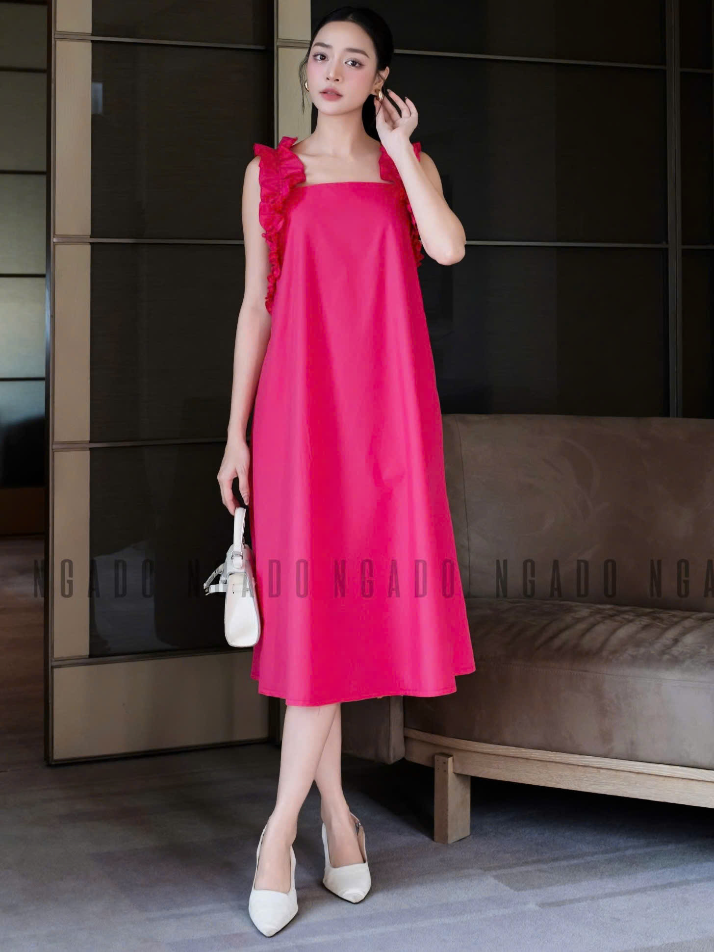 ✨Đầm hồng sen nhún vai NGADO , đầm suông , đầm dài