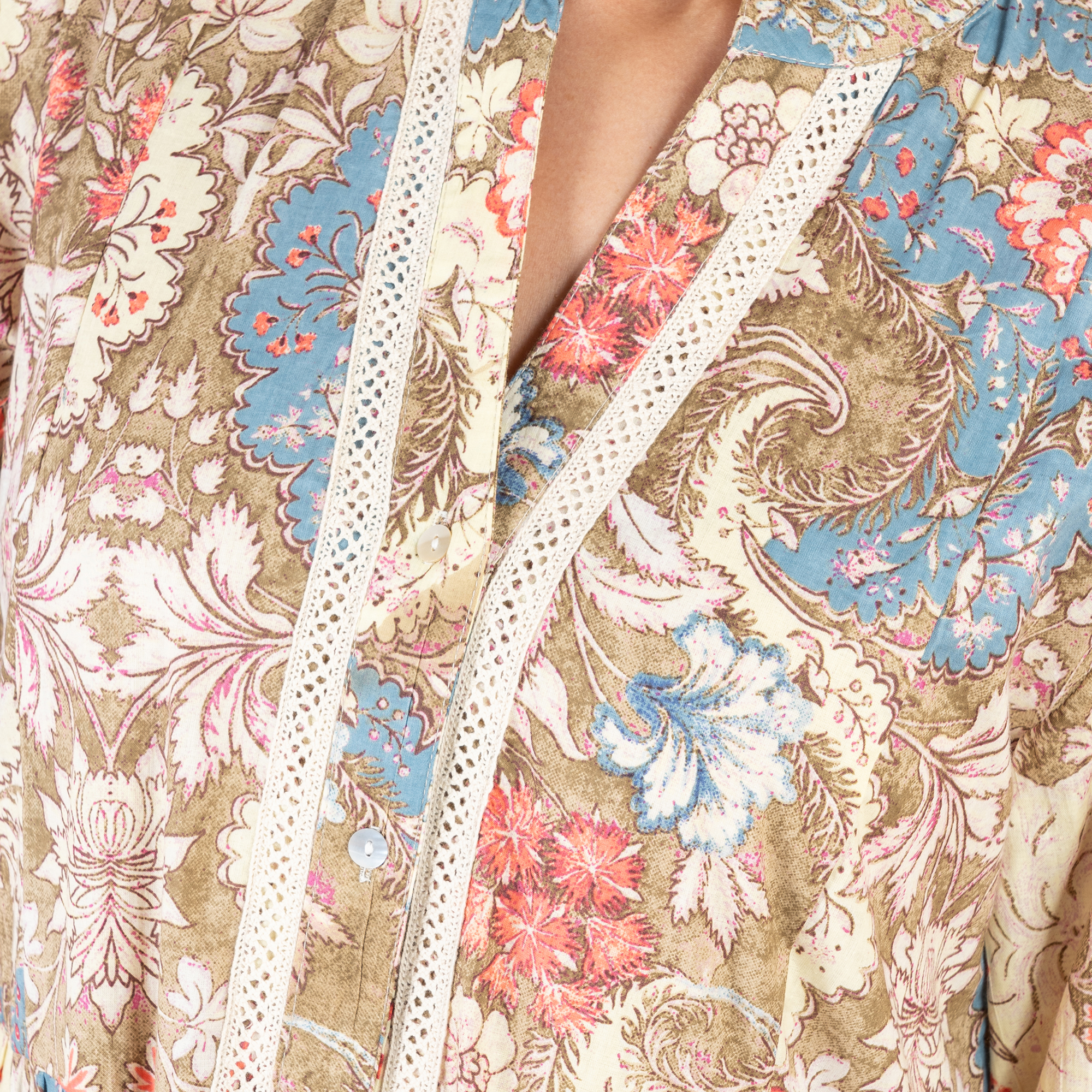 Maxi Hoa Phối Ren Ánh Bạc Cotton Isla Bonita chất liệu cotton cao cấp, mềm mại. Nổi bật phần cổ áo phối ren kết ánh bạc, nơ tua rua màu hồng nữ tính. Họa tiết