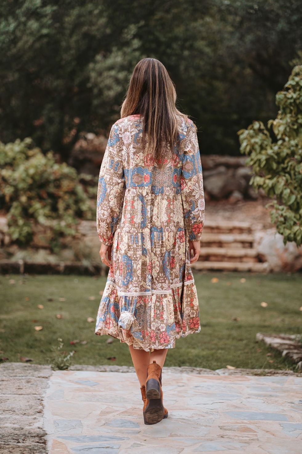 Maxi Boho Dài Tay Kết Cườm Cotton Isla Bonita, chất liệu cotton cao cấp, mềm mại, nổi bật phần ngực trước kết cườm sang trọng. Họa tiết thổ cẩm độc đáo. Phom suông. Dài Đầm