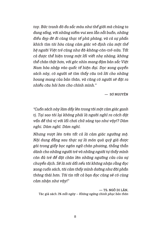 … Các mẩu chuyện nhỏ trong cuốn sách này có màu sắc chung là câu chuyện về những lựa chọn. Truyền thống hay phi truyền thống, mới hay cũ, tốt hay xấu, đúng hay sai là những đánh giá không có tính tuyệt đối. Chúng tùy thuộc vào hệ quy chiếu lăng kính, đối tượng, thời gian mà bạn chọn. Dám Nghi – Dám Nghĩ – Dám Nghỉ khuyến khích bạn gieo một sự hoài nghi vừa vặn để thôi thúc bạn đi tìm câu trả lời với một cái đầu mở, một trái tim nhạy cảm hồn nhiên để biết nghĩ cho bản thân cũng như cho người khác, và một sự dũng cảm để bỏ đi giá trị không còn đúng người đúng chỗ. Khi nói đến “Dám”, tôi cổ vũ sự thử nghiệm chừng mực và đề cao việc cân nhắc an toàn. Nói cách khác, tôi khuyến khích sự thử nghiệm liều lĩnh bứt phá theo tinh thần của các môn thể thao mạo hiểm: bạn nên trang bị thiết bị bảo hộ cần thiết, hỏi ý kiến chuyên gia và người có hiểu biết về pháp luật trước khi bắt đầu. Bạn cũng nên dự trù phương án xử lý sự cố. Dám nghi, dám nghĩ, dám nghỉ, hay dám hành động gì đi nữa chung quy cũng chỉ là để làm cho quỹ thời gian hữu hạn mỗi ngày trong cuộc đời này trở nên ý nghĩa nhất vì thời gian là nguồn tài nguyên quý giá nhất và không thể tái tạo lại của mỗi người. Tôi cảm ơn bạn vì đã dành thời gian cho quyển sách này.”