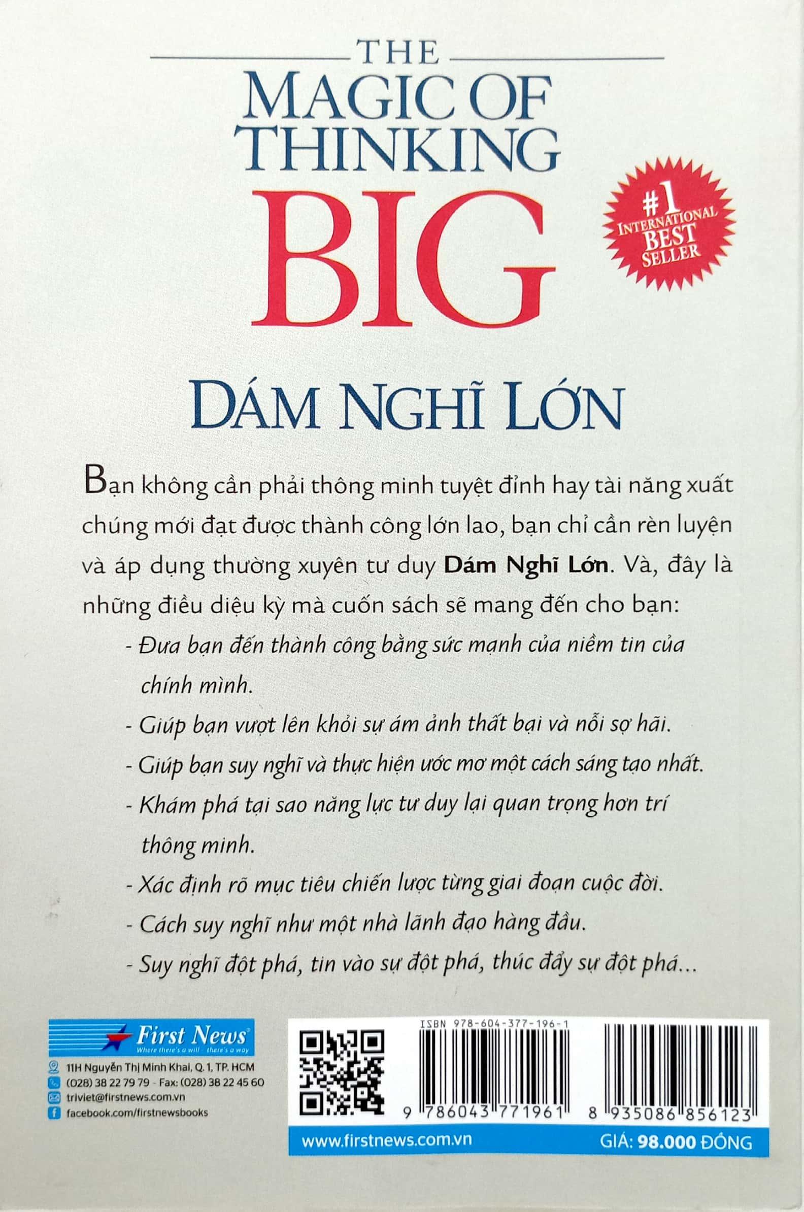 Với Dám Nghĩ Lớn!, bạn sẽ sống tự tin hơn, giàu có hơn, hạnh phúc hơn, đạt được những thành tựu to lớn, kiếm được nhiều tiền, có nhiều bạn và được mọi người tôn trọng. Bạn sẽ hiểu tư duy táo bạo mang đến điều kỳ diệu cho bạn như thế nào. Hãy bắt đầu với câu nói của nhà hiền triết vĩ đại Disraeli: “Cuộc đời thật ngắn ngủi, do vậy, đừng sống nhỏ nhoi.”