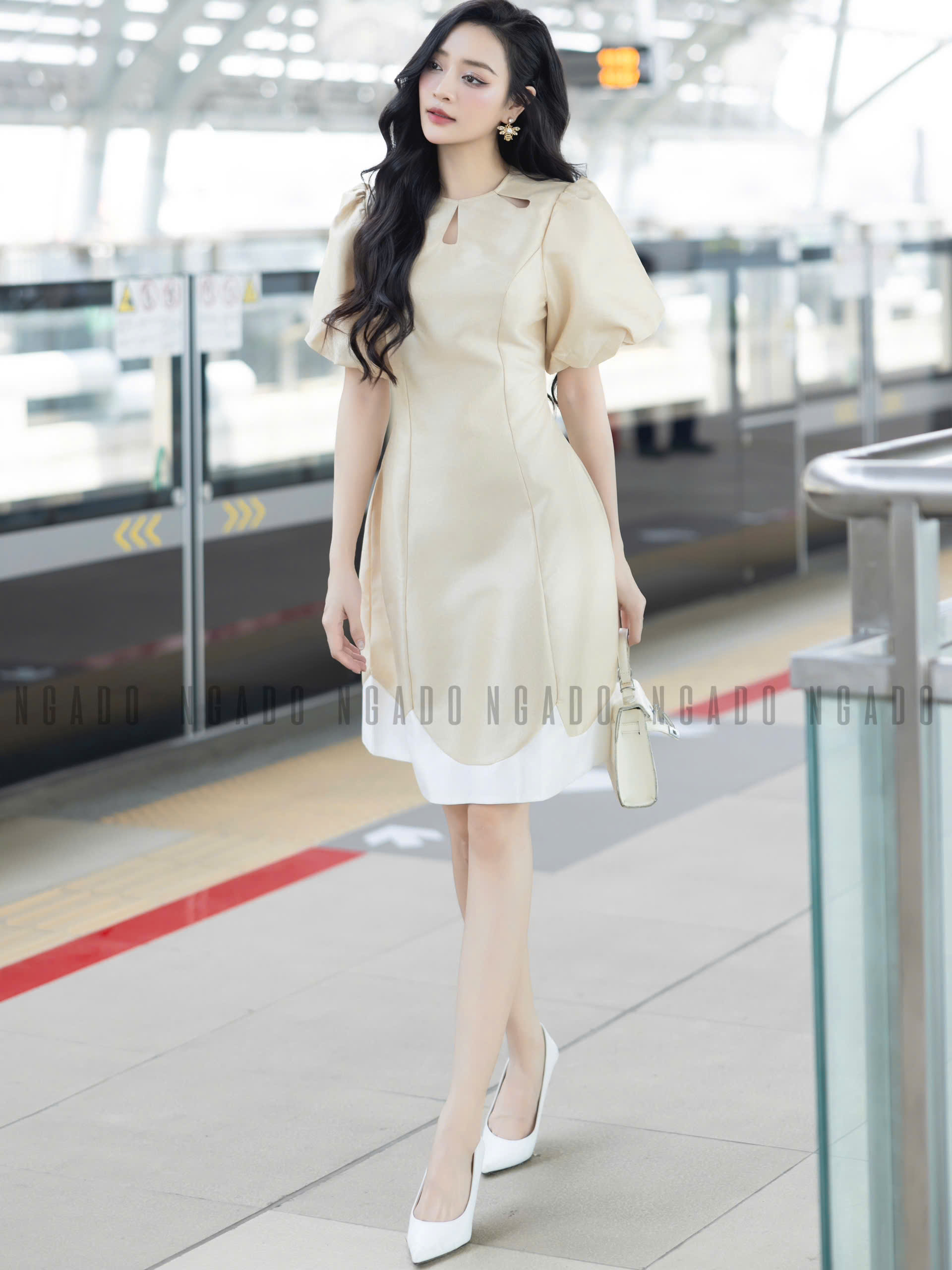 ✨Đầm nude tay phồng NGADO , đầm dự tiệc , đầm thiết kế