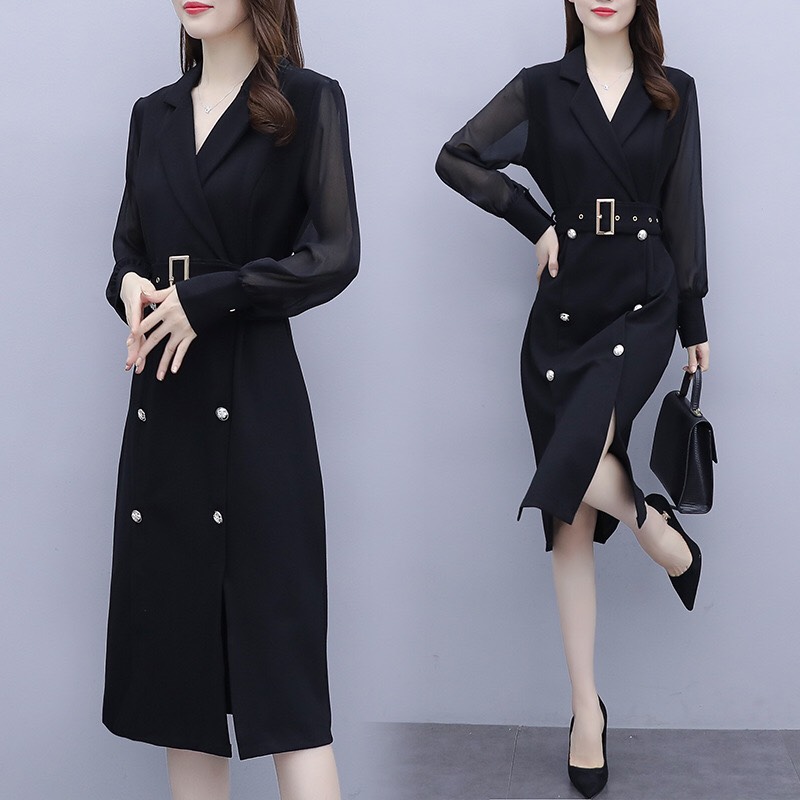 Chất: cotton lụa phối tay voan Màu: đen Kiểu dáng: đầm ôm, cổ vest, tay voan dài càu nút cổ tay, xẻ tà trước 2 bên, kèm nịt rời, dây kéo sau lưng Size: M L XL