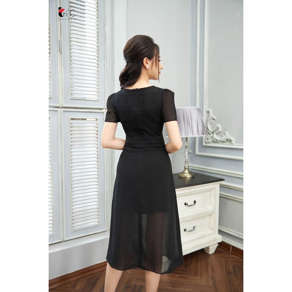 ✨Đầm ren ôm Tri'C Luxury tay bồng xẻ tà Đen A19820