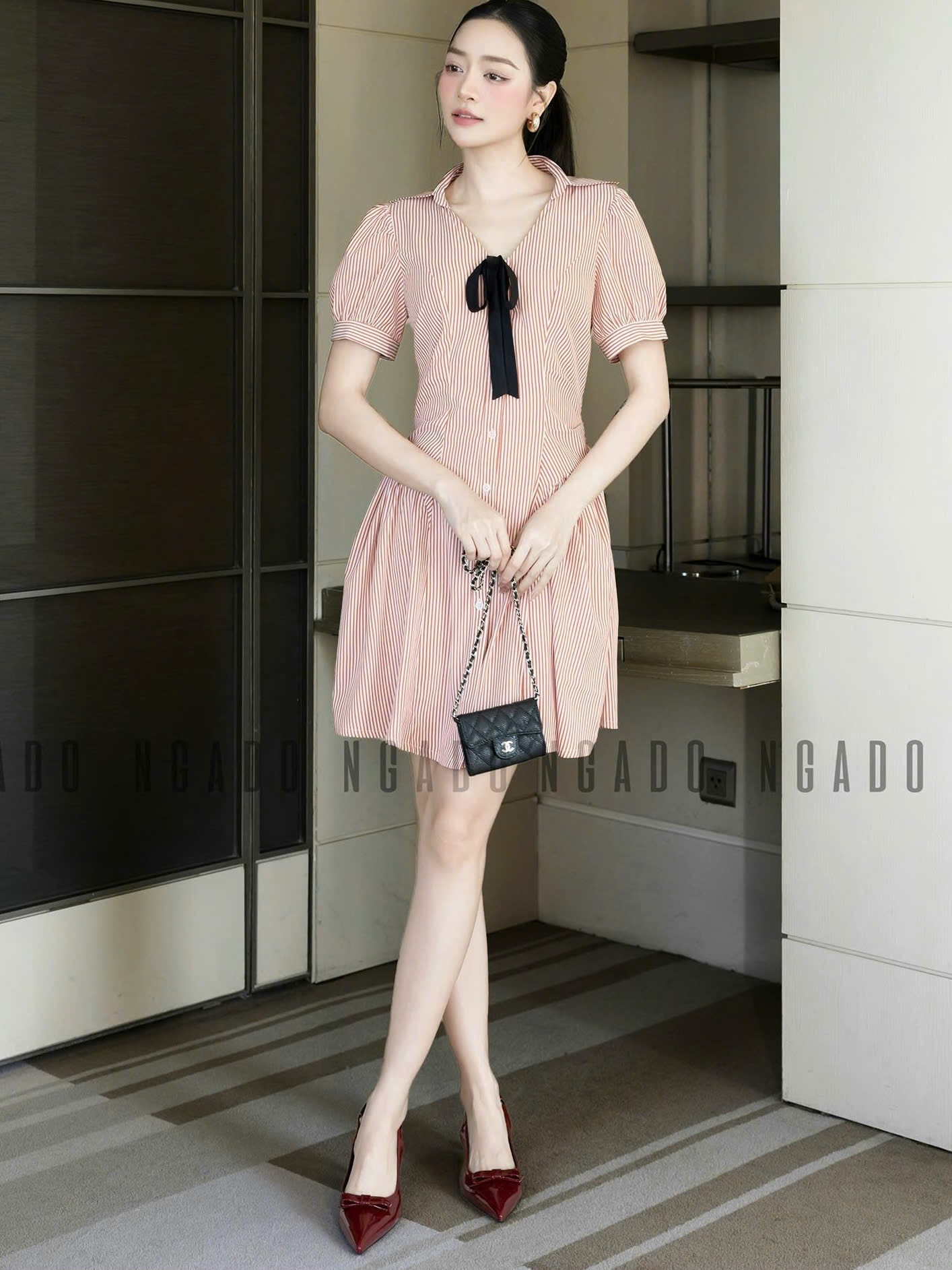 ✨Đầm sọc cam đính nơ NGADO , đầm kiểu Nữ , đầm kẻ sọc