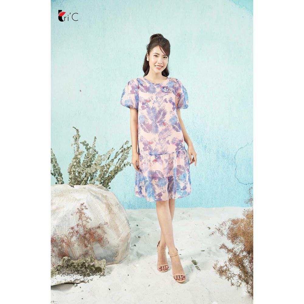 ✨Đầm suông họa tiết Tropical, tay bồng, đính bông Tri'C Luxury A25021 Xanh cam