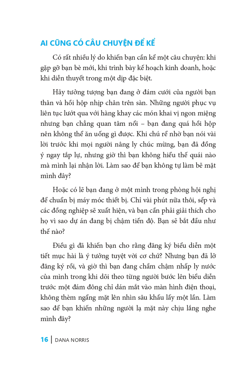 Ai cũng có câu chuyện để kể     Có rất nhiều lý do khiến bạn cần kể một câu chuyện: khi gặp gỡ bạn bè mới, khi trình bày kế hoạch kinh doanh, hoặc khi diễn thuyết trong một dịp đặc biệt.   Nghệ thuật kể chuyện không chỉ để khuấy động không khí cho đám đông mà còn là công cụ hữu ích cho cuộc sống. Ví dụ khi bạn đang tham dự một cuộc họp kinh doanh, một câu chuyện sẽ giúp bạn nhấn mạnh quan điểm của mình hơn rất nhiều; một câu chuyện cũng rất cần thiết để kêu gọi tình nguyện viên cho một tổ chức. Cho dù bạn đang kể chuyện cho bạn bè, sếp, khách hàng hay thậm chí một người xa lạ, quyển sách “Dẫn lối ngôn từ” cũng sẽ giúp ích cho bạn. Bạn sẽ nhận ra rằng: Đúng, bạn có thể kể chuyện.     10 quy tắc kể chuyện để thuyết phục     Trong quyển sách Dẫn Lối Ngôn Từ, tác giả tiết lộ tất cả những gì đã học được về nghệ thuật kể chuyện thông qua 10 quy tắc quan trọng.     Quy tắc 1: Xác định mục đích: cung cấp cho bạn bối cảnh và đối tượng khán giả. Nhiệm vụ của bạn là liệt kê ra một vài mục đích thuyết phục cho mỗi tình huống.     Quy tắc 2: Sử dụng cốt truyện: Hiểu được cốt truyện làchìa khóa để bạn biến trải nghiệm cá nhân thành một câuchuyện khiến người khác không thể không lắng nghe. Chương này đào sâu hơn và xem bạn có thể kết hợp mục đích với chủ đề để tạo thành một câu chuyện hấp dẫn như thế nào.     Quy tắc 3: Thu thập chất liệu tốt nhất: Bạn đã học được cách xác định mục đích và sử dụng cốt truyện để định hình những gì mình sẽ kể. Phần này chuyển sang phần thú vị – tạo ra câu chuyện thực sự.     Quy tắc 4: Xác định trọng tâm: phần này giúp bạn định hình lại mọi thứ, cắt gọt câu chuyện đến phần quan trọng nhất để duy trì được sự chú ý của người nghe.     Quy tắc 5: Bất ngờ ở phút cuối: Cho dù mục đích của bạn khi kể chuyện là gì – để giải trí, cung cấp thông tin hay thuyết phục khán giả – thì phần kết cũng phải đảm bảo rằng bạn sẽ đạt được mục đích đó.     Quy tắc 6: Ai cũng có thể kể chuyện: Một màn trình diễn tuyệt vời sẽ không thể khỏa lấp cho một câu chuyện dở tệ. Nhưng một câu chuyện tuyệt vời,dù được kể bởi một người không chuyên, vẫn có thể thu hút khán giả.     Quy tắc 7: Dễ tổn thương là sức mạnh: Khi tạo dựng câu chuyện của riêng mình, việc chia sẻ mặt mềm yếu của bản thân là một cách hiệu quả để tạo ra tác động cảm xúc cho câu chuyện.     Quy tắc 8: Tôn trọng khán giả: Giúp bạn xác định xem ai sẽ là khán giả để điều chỉnh câu chuyện cho phù hợp với họ. Phần lớn công đoạn này sẽ được thực hiện từ sớm, và phần còn lại có thể được xác định ngay trước lúc bạn bắt đầu kể chuyện.     Quy tắc 9: Luôn luôn luyện tập: Gợi ý những liệu pháp phơi bày bản thân, giúp bạn cảm thấy thoải mái khi truyền tải trực tiếp câu chuyện đó cho những người đang háo hức lắng nghe bấy nhiêu.     Quy tắc 10: Chuẩn bị sẵn sàng: Liệt kê danh sách những điều cần chuẩn bị kỹ càng để đảm bảo bạn và câu chuyện của mình tỏa sáng.     Tác giả Dana Norris viết lại một cách giản dị và nhiều gợi ý dễ hiểu để rút ra những bí quyết đơn giản nhưng hiệu quả trong giao tiếp, giúp người đọc có thể nói chuyện với bất cứ ai, vào bất cứ thời điểm nào, tại bất cứ nơi nào. Ngoài ra, cuốn sách còn nhằm giúp người đọc liên tục trau dồi khả năng giao tiếp, trở thành người kể chuyện, giao tiếp ngày càng tốt hơn
