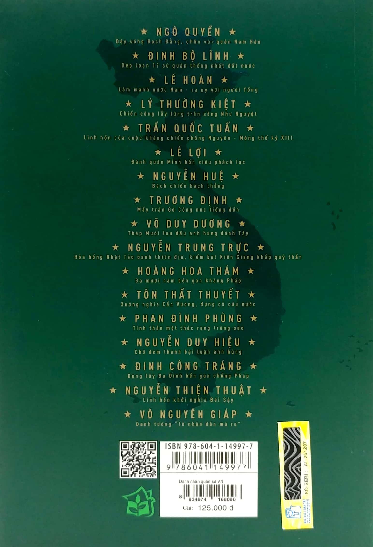 Mua tại TiktokSách viết về 17 danh nhân quan sự Việt Nam: 1. Ngô Quyền, 2. Đinh Bộ Lĩnh, 3. Lê Hoàn, 4. Lý Thường Kiệt 5. Trần Quốc Tuấn,,6. Lê Lợi,, 7. Nguyễn Huệ, 8. Trương Định 9. Võ Duy Dương,10. Nguyễn Trung Trưc, 11. Hoàng Hoa Thám, 12. Tôn Thất Thuyết, 13. Phan Đình Phùng,14. Nguyễn Duy Hiệu,15. Đinh Công Tráng, 16. Nguyễn Thiện Thuật và 17. Võ Nguyên Giáp. Đây là tập sách hay, có giá trị lịch sử và văn học, qua nghệ thuật viết theo lối kể chuyện với việc tổng hợp các dữ liệu công phu, hấp dẫn .