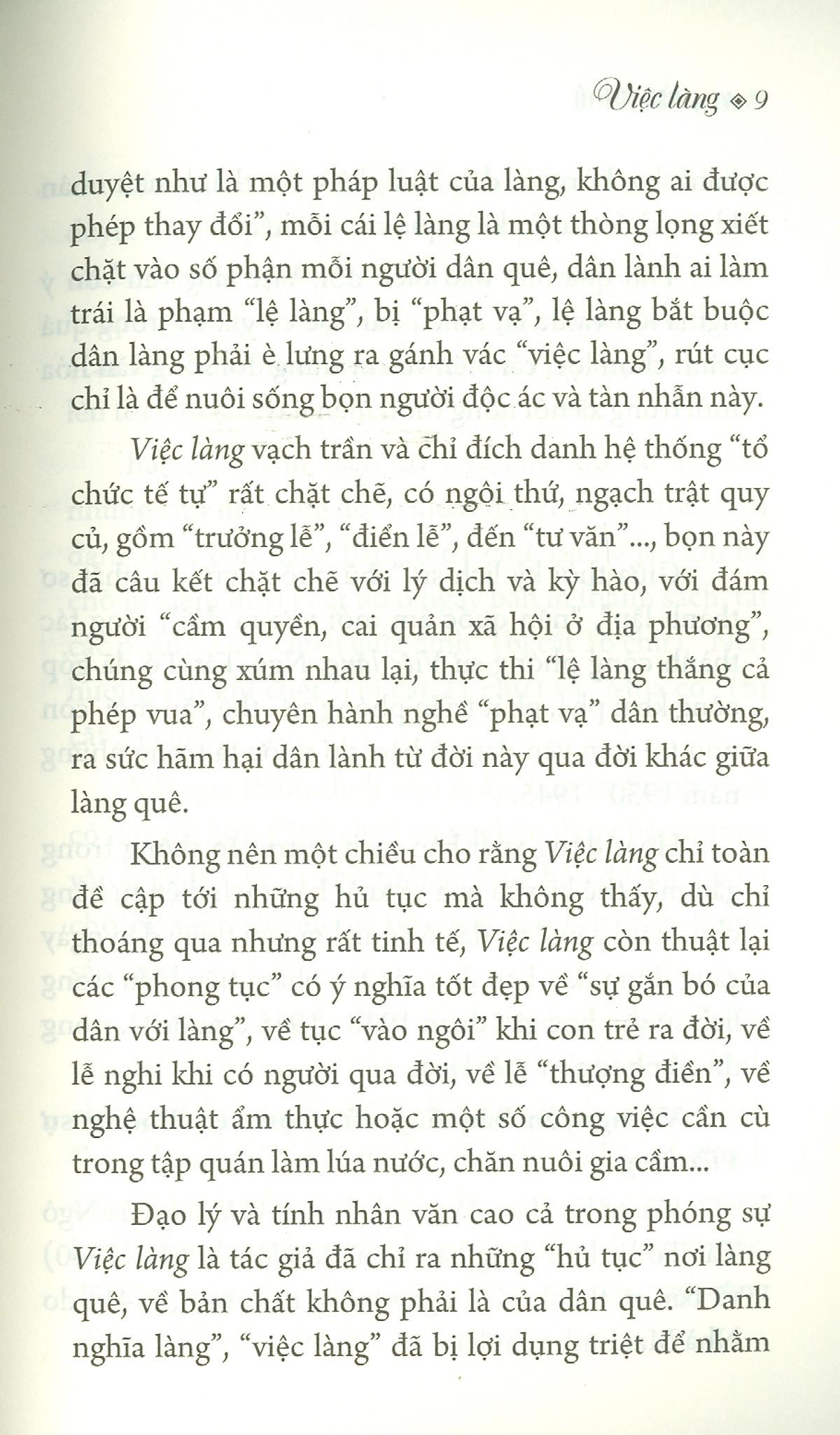 Trong tập phóng sự Việc làng, làng Việt Nam cổ xưa đã biến thành một triều đình phong kiến thu nhỏ, lợi dụng sự mê tín của dân chúng, thực dân phong kiến đã giở mọi trò lừa bịp nhằm thực hiện chính sách ngu dân, bóc lột.