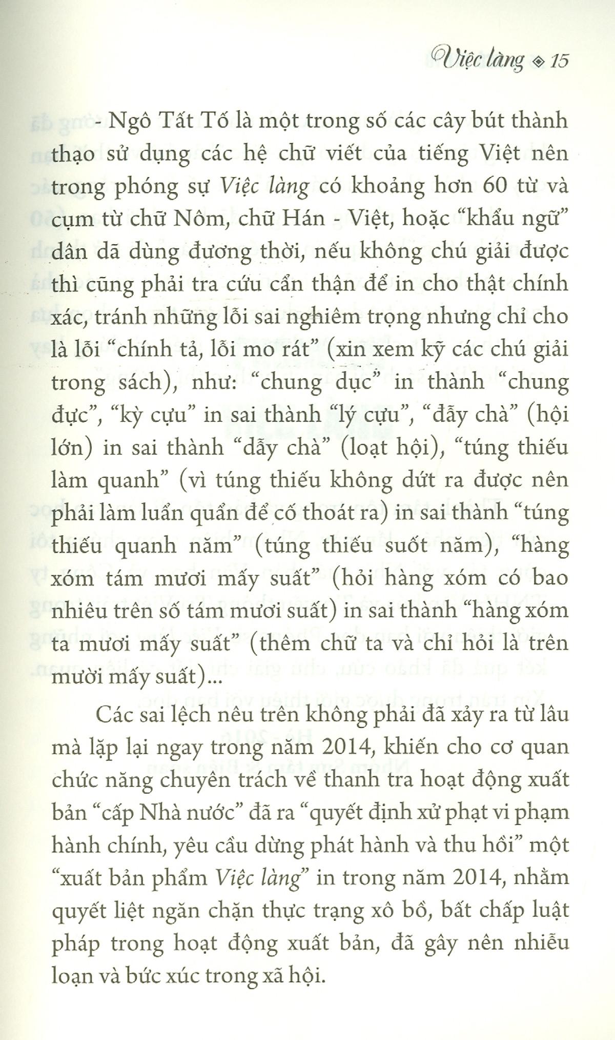 Phóng sự việc làng chứa đựng một khối lượng kiến thức sâu rộng, được ghi lại rất cụ thể, rành mạch, đã lôi cuốn bạn đọc đi từ ngạc nhiên này đến bất ngờ khác rất chi tiết về bộ mặt nông thôn với hàng loạt phong tục, hủ tục diễn ra liên miên dai dẳng trong đời sống và xã hội dân quê cách đây non một thế kỷ.