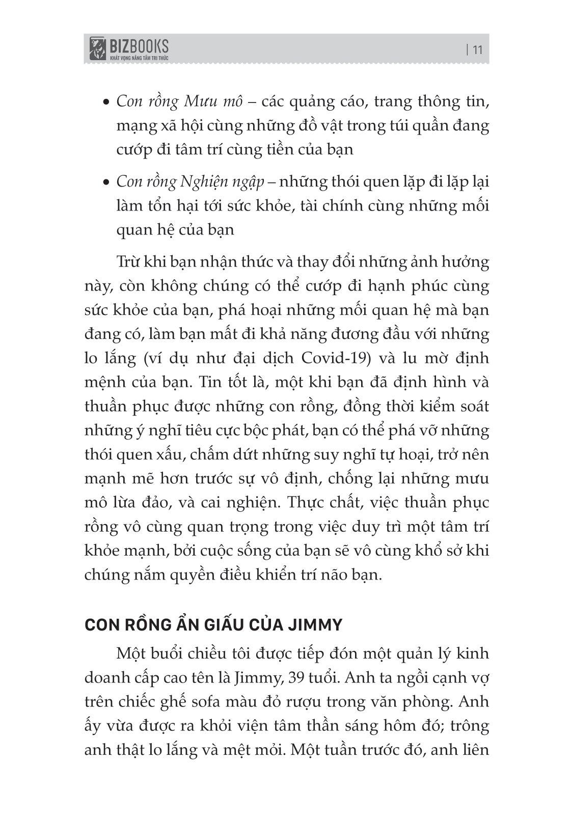 Cuốn sách đã phân tích tất cả những lí do, cả rõ ràng lẫn tiềm ẩn mà những con rồng và ý nghĩ tiêu cực không ngừng thì thầm trong não bộ của bạn, làm bạn cảm thấy buồn bực, lo âu, u uất, tức giận hay mất kiểm soát. Với những phương pháp nhằm chinh phục các con rồng, bạn sẽ lấy lại quyền kiểm soát não bộ của m.ình và lựa chọn những gì m.ình muốn nghe. Bạn sẽ không phải đương đầu trước những suy nghĩ tiêu cực hay để thói quen xấu hủy hoại sức khỏe cùng các mối quan hệ của m.ình khi trải qua căng thẳng cực độ, sang chấn hay tiếc thương. Bạn sẽ nhận ra đâu là sự thật, xây dựng được sự tự tin, đưa tâm trí m.ình vào khuôn khổ, cảm thấy hạnh phúc hơn, bình thản hơn và nắm trong tay vận mệnh cùa m.ình.